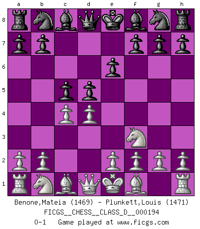 Last move : 0-1 2013 June 24 1:42:55 [Event "FICGS__CHESS__CLASS_D__000194"] [Site "FICGS"] [Date "2013.05.12"] [Round "1"] [White "Benone,Mateia"] [Black "Plunkett,Louis"] [Result "0-1"] [WhiteElo "1469"] [BlackElo "1471"] 1.Nf3 d5 2.d4 e6 3.c4 c5 0-1 This chess game has been lost on time (started : 2013.05.12 20:20:51) Reti Opening Player Black won this chess game. Follow this game move after move (download)When you see a good move, look for a better one. (Emanuel Lasker) Du musst Deinen Gegner in einen tiefen dunklen Wald führen wo 2+2=5 ist und wo der Weg, der wieder hinausführt, nur breit genug für einen ist. (Mikhail Nekhemyevich Tal) En el Ajedrez, tal como en la vida, las bendiciones de hoy pueden ser el veneno del mañana. (Assaic) Les réformistes prétendent que les progrès de la théorie conduiront à la disparition des échecs, et qu'il faut, pour leur rendre vie, en remanier les règles. En réalité, qu'exprime cette affirmation? Le mépris de l'intuition, de l'imagination et de tous les autres éléments qui font des échecs un art. (Alexander Alekhine) There will be no order, only chaos. (Sol Robeson in Pi by Darren Aronofsky)