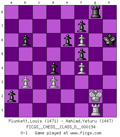 Last move : 0-1 2014 January 24 11:46:14 [Event "FICGS__CHESS__CLASS_D__000194"] [Site "FICGS"] [Date "2013.05.12"] [Round "1"] [White "Plunkett,Louis"] [Black "Aahlad,Yeturu"] [Result "0-1"] [WhiteElo "1471"] [BlackElo "1447"] 1.f4 d5 2.Nf3 c5 3.g3 g6 4.Bg2 Bg7 5.O-O Nc6 6.c3 Nf6 7.d3 Bf5 8.Nh4 Qd7 9.Nxf5 Qxf5 10.Nd2 O-O 11.e4 Qd7 12.Qe2 Rfc8 13.e5 Ne8 14.Nb3 b6 15.Bd2 Nc7 16.Rad1 a5 17.Be1 a4 18.Nd2 e6 19.h4 h5 20.Nf3 Ne7 21.Nh2 a3 22.b3 Nf5 23.g4 hxg4 24.Nxg4 Rab8 25.Rf3 Nb5 26.Rh3 d4 27.Qc2 Nxc3 28.Bxc3 dxc3 29.Qxc3 Qd4+ 30.Qxd4 cxd4 31.Be4 Rc2 32.h5 Rxa2 33.h6 Bf8 34.Bxf5 gxf5 35.Nf6+ Kh8 36.Kh1 Be7 37.h7 Bxf6 38.exf6 Rb2 39.Rg1 a2 40.Rhg3 Rb1 41.Rg8+ Kxh7 42.R8g7+ Kh6 43.R7g3 Rxg1+ 44.Rxg1 Rc8 45.Kg2 Rg8+ 0-1 Bird's Opening Kingside Castling by player White (move 5) Kingside Castling by player Black (move 10) Player Black won this chess game. Follow this game move after move (download)I have never in my life played the French Defence, which is the dullest of all openings. (Wilhelm Steinitz) Der beste Spieler in einem Turnier gewinnt es nie. Er landet auf Platz zwei oder drei. (Siegbert Tarrasch) Si yo gano un torneo, yo lo gano por mí mismo. Yo hago las jugadas. Nadie me ayuda. (Bobby Fischer) On entre au jeu d'Echecs comme on entre en Religion. Pour le joueur d'Echecs, la partie d'Echecs c'est l'office, la messe, le défilé du 1er Mai, le dépôt de gerbe au Monument aux Morts. C'est un drame sacré. (Michel Roos) Memory is a complicated thing, a relative to truth, but not its twin. (Barbara Kingsolver, Animal Dreams)