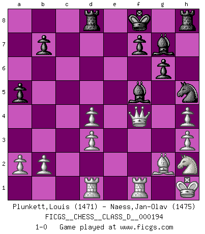 Last move : 1-0 2013 October 19 4:37:48 [Event "FICGS__CHESS__CLASS_D__000194"] [Site "FICGS"] [Date "2013.05.12"] [Round "1"] [White "Plunkett,Louis"] [Black "Naess,Jan-Olav"] [Result "1-0"] [WhiteElo "1471"] [BlackElo "1475"] 1.f4 d5 2.Nf3 g6 3.g3 Bg7 4.Bg2 Nh6 5.O-O Nf5 6.c3 Nd7 7.d3 Nf6 8.Na3 c6 9.Nc2 Qb6+ 10.Kh1 h5 11.Qe1 h4 12.gxh4 Nd6 13.Ne3 Kf8 14.Ng5 a5 15.Nc2 Nf5 16.Nf3 Nd6 17.Rb1 Qc7 18.Ncd4 c5 19.Nc2 Bd7 20.Ne3 Nf5 21.Nxf5 Bxf5 22.Be3 Rd8 23.h3 Nh5 24.Nh2 c4 25.Rd1 e5 26.Qf2 cxd3 27.exd3 d4 28.cxd4 exf4 29.Bxf4 Qxf4 30.Qxf4 1-0 This chess game has been lost on time (started : 2013.05.12 20:20:51) Bird's Opening Kingside Castling by player White (move 5) Player White won this chess game. Follow this game move after move (download)You sit at the board and suddenly your heart leaps. Your hand trembles to pick up the piece and move it. But what Chess teaches you is that you must sit there calmly and think about whether it's really a good idea and whether there are other better ideas. (Stanley Kubrick) Taktik ist was man tun muß, wenn etwas zu tun ist. Strategie ist was man tun muß, wenn nichts zu tun ist. (Savielly Grigorievitsch Tartakower) Del Ajedrez se ha dicho que la vida no es lo suficientemente larga para él, pero eso es culpa de la vida, no del Ajedrez. (William Ewart Napier) Les Echecs ne sont pas pour les âmes timides. Ils requièrent un homme entier, qui ne s'arrête pas aveuglément à ce qui a été déjà établi, mais qui tente individuellement de sonder les profondeurs du jeu. (W. Steinitz) If you are good, you will be assigned all the work. If you are really good, you will get out of it. (Dan Rotaru)