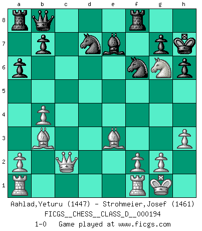 Last move : 1-0 2013 October 4 18:39:36 [Event "FICGS__CHESS__CLASS_D__000194"] [Site "FICGS"] [Date "2013.05.12"] [Round "1"] [White "Aahlad,Yeturu"] [Black "Strohmeier,Josef"] [Result "1-0"] [WhiteElo "1447"] [BlackElo "1461"] 1.e4 e5 2.Nf3 Nc6 3.Bb5 a6 4.Ba4 Nf6 5.d3 h6 6.Be3 Be7 7.O-O O-O 8.c4 d6 9.Nc3 Be6 10.h3 Nb8 11.b4 Nbd7 12.Bb3 c6 13.d4 exd4 14.Nxd4 d5 15.cxd5 cxd5 16.Nxe6 fxe6 17.exd5 exd5 18.Nxd5 Kh8 19.Nf4 Qb8 20.Ng6+ Kh7 21.Qc2 1-0 Ruy Lopez : Anderssen variation Kingside Castling by player White (move 7) Kingside Castling by player Black (move 7) Player White won this chess game. Follow this game move after move (download)When you don't know what to do, wait for your opponent to get an idea - it's sure to be wrong. (Tarrasch) Ich glaube, ich kenne inzwischen die Gründe für mein Versagen: schachliche Charakterfehler. Ich war nie ein Wunderkind und in meiner gesamten menschlichen Entwicklung immer zu langsam. (Viktor Kortschnoi) Si no le temes a Spassky, entonces elimino el elemento del dinero. (Jim Slater) Karpov est une pièce de musée. (Garry Kasparov) I feel so... helpless. (C-3PO in Star Wars ep.3)