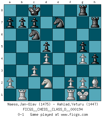 Last move : 0-1 2013 November 16 18:46:14 [Event "FICGS__CHESS__CLASS_D__000194"] [Site "FICGS"] [Date "2013.05.12"] [Round "1"] [White "Naess,Jan-Olav"] [Black "Aahlad,Yeturu"] [Result "0-1"] [WhiteElo "1475"] [BlackElo "1447"] 1.d4 d5 2.Nf3 Nc6 3.Bg5 f6 4.Bf4 g5 5.Bg3 h5 6.h3 Bf5 7.e3 h4 8.Bh2 e6 9.Bd3 Nh6 10.c4 Bb4+ 11.Nc3 Bxc3+ 12.bxc3 Qd7 13.Rb1 O-O-O 14.Bxf5 Nxf5 15.Nd2 Nfe7 16.O-O Rdg8 17.e4 f5 18.cxd5 exd5 19.exf5 Qxf5 20.Qg4 Qxg4 21.hxg4 Rh7 0-1 This chess game has been lost on time (started : 2013.05.12 20:20:51) Queen's pawn game, Chigorin variation Queenside Castling by player Black (move 13) Kingside Castling by player White (move 16) Player Black won this chess game. Follow this game move after move (download)Morphy was probably the greatest genius of them all. (Bobby Fischer) Mit sehr nachdenklichem Gesicht schreitet Bobby durch den Turniersaal. Was ist passiert?, fragt Lombardy. Ich stehe schlecht, antwortet Fischer. Lombardy: Dann biete doch einfach Remis an. Fischer: So schlecht stehe ich nun auch wieder nicht! (Robert James Fischer) Un sacrificio se refuta mucho mejor al aceptarlo. (Wilhelm Steinitz) Je menace de comprendre la position. (Anonyme) Players are not good because they find tactics, it is about the way to find the positions in which those tactics are hidden. (Luc-Olivier Leclerc)