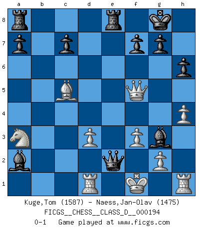 Last move : 0-1 2013 May 19 2:25:53 [Event "FICGS__CHESS__CLASS_D__000194"] [Site "FICGS"] [Date "2013.05.12"] [Round "1"] [White "Kuge,Tom"] [Black "Naess,Jan-Olav"] [Result "0-1"] [WhiteElo "1587"] [BlackElo "1475"] 1.e4 d5 2.Nf3 dxe4 3.Ng5 e5 4.d3 Nc6 5.Nc3 exd3 6.Bxd3 Be7 7.h4 Nf6 8.Qe2 h6 9.Nf3 O-O 10.Bd2 Nb4 11.Nxe5 Bd6 12.Nc4 Bg4 13.f3 Bg3+ 14.Kf1 Be6 15.Ne4 Nxd3 16.cxd3 Nxe4 17.Qxe4 Re8 18.Bc3 b5 19.Na3 b4 20.Bxb4 Bxa2 21.Qf5 Qd4 22.Bc5 Qxb2 23.Rd1 Qe2+ 0-1 Scandinavian (centre counter) defense Kingside Castling by player Black (move 9) Player Black won this chess game. Follow this game move after move (download)Chess demands total concentration. (Bobby Fischer) Offener Brief an US-Präsident Bush anlässlich der Verhaftung Bobby Fishers: Verhaften Sie mich. Stecken Sie mich in dieselbe Zelle wie Bobby Fisher und geben Sie uns ein Schachspiel mit. (Boris Vassilievich Spassky) Morphy probablemente fue el genio más grande de todos. (Bobby Fischer) La guerre est enfant de la passion, la passion est enfant du narcissisme et le narcissisme est l'enfant. (...) Une autre partie ? (Thibault de Vassal) A good player is always lucky. (Capablanca)