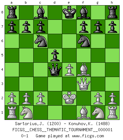 Last move : 0-1 2006 July 17 2:11:6 [Event "FICGS__CHESS__THEMATIC_TOURNAMENT__000001"] [Site "FICGS"] [Date "2006.05.19"] [Round "1"] [White "Sartorius,Julien"] [Black "Konuhov,Konstantin"] [Result "0-1"] [WhiteElo "1200"] [BlackElo "1488"] 1.e4 e5 2.f4 exf4 3.d4 Qh4+ 4.Kd2 Qf2+ 5.Kd3 Nc6 6.Qf3 Qxd4+ 7.Ke2 Nf6 8.Bxf4 d5 0-1 This chess game has been lost on time (started : 2006.05.19 15:9:57) KGA : Villemson (Steinitz) gambit Player Black won this chess game. Follow this game move after move (download)An attack on the wing should be met by play in the center. (Nimzovitch) Ich verstehe den Grund nicht, warum die Aufteilung in Frauen und Männer überhaupt im Schach besteht. (Judith Polgar) Con o sin el título, Bobby Fischer fue sin lugar a dudas el mas grande jugador de su época. (Burt Hochberg) Mon pion favori sur ma case favorite ! Bronstein en parlant d'un coup de pion en h5 quand il avait les Noirs. Good luck. You're gonna need it. (Han Solo in Star Wars ep.6)