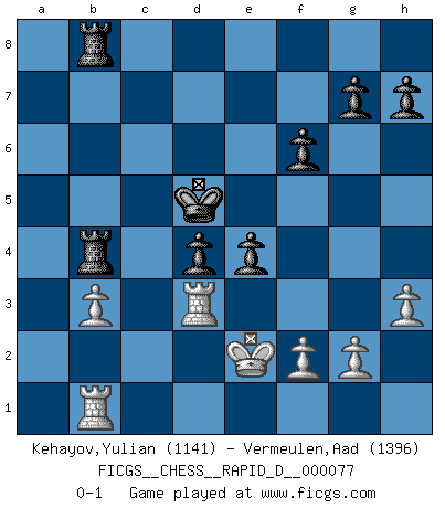 Last move : 0-1 2013 June 17 16:59:5 [Event "FICGS__CHESS__RAPID_D__000077"] [Site "FICGS"] [Date "2013.05.12"] [Round "1"] [White "Kehayov,Yulian"] [Black "Vermeulen,Aad"] [Result "0-1"] [WhiteElo "1141"] [BlackElo "1396"] 1.e4 e6 2.d4 d5 3.e5 c5 4.c3 Nc6 5.Nf3 cxd4 6.Nxd4 Nxe5 7.Nd2 Bd7 8.Be2 Nf6 9.O-O Be7 10.h3 a6 11.N2f3 Nxf3+ 12.Nxf3 O-O 13.Ne5 Rc8 14.Nxd7 Qxd7 15.Bg5 Ne4 16.Bxe7 Qxe7 17.Qd4 Qc5 18.Qxc5 Rxc5 19.Bf3 Nd6 20.Rad1 Rfc8 21.Rfe1 b5 22.Be2 Nc4 23.Bxc4 Rxc4 24.a3 a5 25.Re3 b4 26.axb4 axb4 27.cxb4 Rxb4 28.b3 Rcb8 29.Rb1 Kf8 30.Kf1 Ke7 31.Kg1 Kd6 32.Kf1 e5 33.Ke2 f6 34.Kf3 d4 35.Rd3 Kd5 36.Ke2 e4 0-1 French : Advance, Paulsen attack Kingside Castling by player White (move 9) Kingside Castling by player Black (move 12) Player Black won this chess game. Follow this game move after move (download)Chess is above all, a fight ! (Emanuel Lasker) Schachspieler können ausgezeichnet Varianten am Schachbrett berechnen, aber nicht im realen Leben. Zu stark ist der Individualismus im Schach ausgeprägt, und für viele ist ein kleiner momentaner persönlicher Vorteil wichtiger als ein weit größerer Vorteil von morgen. (Anatoly Karpov) Coloca el contenido de las piezas del Ajedrez en un sombrero, agitalo vigorosamente, arrojalas en un tablero desde una altura de 30 centimetros y así obtendras el estilo de Steinitz. (H. E. Bird) Donnez-moi un Cavalier en 6e et je gagnerais toutes mes parties. (Steinitz) No man has ever achieved immortality in his own life time. (Unknown)