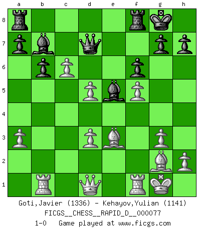 Last move : 1-0 2013 June 17 20:35:2 [Event "FICGS__CHESS__RAPID_D__000077"] [Site "FICGS"] [Date "2013.05.12"] [Round "1"] [White "Goti,Javier"] [Black "Kehayov,Yulian"] [Result "1-0"] [WhiteElo "1336"] [BlackElo "1141"] 1.c4 c5 2.Nc3 e5 3.g3 Nf6 4.Bg2 Be7 5.d3 O-O 6.Nf3 d5 7.cxd5 Nxd5 8.Nxe5 Bf6 9.Nxd5 Bxe5 10.Nc3 Qf6 11.Nd5 Qd6 12.Rb1 Be6 13.e4 Nd7 14.O-O Nb6 15.f4 Nxd5 16.f5 Bd7 17.exd5 f6 18.Be3 b6 19.a3 Bc8 20.b4 Bb7 21.bxc5 Qd7 22.c6 1-0 English : Symmetrical variation Kingside Castling by player Black (move 5) Kingside Castling by player White (move 14) Player White won this chess game. Follow this game move after move (download)You have to have the fighting spirit. You have to force moves and take chances. (Bobby Fischer) Die unerbitterlichsten Regeln im Schach sind die Ausnahmen. (Savielly Grigorievitsch Tartakower) Preferería tener un Peón que un dedo. (Reuben Fine) Botvinnik disait en comparant les échecs à la musique: Il existe une science dont le but est l'étude de l'acoustique et des sons. Mais il y a aussi un art qui se sert de l'océan des sons : c'est la musique. De toute évidence, il en est de même pour la pensée. La logique est l'étude des lois de la réflexion et les échecs reflètent, en tant qu'art, le côté logique de la réflexion, sous la forme d'images artistiques... Extrait de Fischer - Spassky, Reykjavik 1972 par Alexander & F. Wyndham (Ed. Solar), p 37. Macintosh - we might not get everything right, but at least we knew the century was going to end. (Douglas Adams)