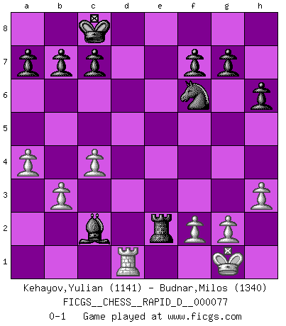 Last move : 0-1 2013 June 12 20:31:58 [Event "FICGS__CHESS__RAPID_D__000077"] [Site "FICGS"] [Date "2013.05.12"] [Round "1"] [White "Kehayov,Yulian"] [Black "Budnar,Milos"] [Result "0-1"] [WhiteElo "1141"] [BlackElo "1340"] 1.e4 e5 2.c3 d5 3.exd5 Qxd5 4.Nf3 Bg4 5.Be2 Nc6 6.O-O O-O-O 7.h3 Bf5 8.Na3 Bxa3 9.bxa3 Nf6 10.Bb2 Rhe8 11.Qb3 Qxb3 12.axb3 h6 13.c4 Nd4 14.Nxd4 exd4 15.d3 Rxe2 16.Bxd4 Rxd4 17.a4 Rxd3 18.Rad1 Rxd1 19.Rxd1 Bc2 0-1 Variation Lopez Opening : Lopez Opening Kingside Castling by player White (move 6) Queenside Castling by player Black (move 6) Player Black won this chess game. Follow this game move after move (download)I believe that Chess possesses a magic that is also a help in advanced age. A rheumatic knee is forgotten during a game of Chess and other events can seem quite unimportant in comparison with a catastrophe on the chessboard. (Vlastimil Hort) Ja, jede Frau in Holland liebt mich bestimmt, und alle Männer hassen mich. (Loek van Wely) Solo existe una cosa que Fischer hace en el Ajedrez sin placer: ¡perder!. (Boris Spassky) Les échecs sont plus proches de l'art de l'assassinat que de l'art de la guerre. (Arturo Perez-Reverte) Programming can only do so much before it becomes too much. (Don Groves)