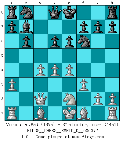 Last move : 1-0 2013 June 24 13:45:3 [Event "FICGS__CHESS__RAPID_D__000077"] [Site "FICGS"] [Date "2013.05.12"] [Round "1"] [White "Vermeulen,Aad"] [Black "Strohmeier,Josef"] [Result "1-0"] [WhiteElo "1396"] [BlackElo "1461"] 1.d4 Nf6 2.c4 e6 3.Nc3 Bb4 4.Qc2 c5 5.a3 Bxc3+ 6.bxc3 b6 7.f3 Bb7 8.e4 d6 9.Ne2 cxd4 10.cxd4 1-0 This chess game has been lost on time (started : 2013.05.12 22:56:42) Nimzo-Indian : Classical, 4...c5 Player White won this chess game. Follow this game move after move (download)You are for me the Queen on d8 and I am the Pawn on d7 !! (Eduard Gufeld) Ein Großmeister muß tausende Partien in seinem Kopf speichern, denn diese sind für Ihn, was die Worte der Muttersprache für gewöhnliche Leute sind, oder Noten für Musiker... (Garry Kasparov) Aún el Rey más flojo huye despavorido ante la amenaza de un Jaque doble. (Aaron Nimzowitsch) Shah mat. Le roi est mort. Cri de fierté d'un joueur venant de terrasser son adversaire, courtoisement, sans effusion de sang. The worth of a book is to be measured by what you can carry away from it. (James Bryce)
