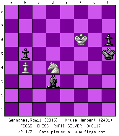 Last move : 1/2-1/2 2013 June 9 15:4:52 [Event "FICGS__CHESS__RAPID_SILVER__000117"] [Site "FICGS"] [Date "2013.05.13"] [Round "2"] [White "Germanes,Ramil"] [Black "Kruse,Herbert"] [Result "1/2-1/2"] [WhiteElo "2315"] [BlackElo "2491"] 1.e4 c5 2.Nf3 d6 3.d4 cxd4 4.Nxd4 Nf6 5.Nc3 a6 6.Be3 e5 7.Nb3 Be6 8.f3 Be7 9.Qd2 O-O 10.O-O-O Nbd7 11.g4 b5 12.g5 Nh5 13.Kb1 Nb6 14.Nd5 Nxd5 15.exd5 Bf5 16.Na5 f6 17.Nc6 Qd7 18.h4 fxg5 19.hxg5 Ng3 20.Rg1 Nxf1 21.Rgxf1 Bg6 22.Rf2 Rae8 23.Rh1 Rf5 24.b3 Bd8 25.Rhf1 Bf7 26.Kb2 Bh5 27.a3 Bf7 28.Ra1 Qb7 29.a4 Bb6 30.axb5 axb5 31.R2f1 Bxe3 32.Qxe3 Bxd5 33.Nb4 Rxf3 34.Qd2 Rxf1 35.Rxf1 Bf7 36.Qxd6 e4 37.Rf5 e3 38.Re5 Qa8 39.Nd3 Rxe5 40.Qxe5 Qe8 41.Kc3 Qxe5+ 42.Nxe5 Be6 43.Kd3 Bf5+ 44.Kxe3 Bxc2 45.b4 Bf5 46.Nf3 Kf7 47.Nd4 Bd7 48.Kf4 Kg6 49.Nf3 Kh5 50.Nd4 h6 51.gxh6 gxh6 52.Nf3 Bc6 53.Nd4 Be8 54.Kf5 Bg6+ 55.Kf6 Bd3 56.Nf3 Be2 57.Nd4 Bd3 58.Nf3 Be2 59.Nd4 Bd3 1/2-1/2 Sicilian : Najdorf, Byrne (English) attack Kingside Castling by player Black (move 9) Queenside Castling by player White (move 10) 10 pieces endgame at move 44 : White KNPPP , Black KBPPP WHITE : King + 1 Knight 3 Pawns BLACK : King + 1 Bishop 3 Pawns 9 pieces endgame at move 44 : White KNPP , Black KBPPP WHITE : King + 1 Knight 2 Pawns BLACK : King + 1 Bishop 3 Pawns 8 pieces endgame at move 51 : White KNPP , Black KBPP WHITE : King + 1 Knight 2 Pawns BLACK : King + 1 Bishop 2 Pawns 7 pieces endgame at move 51 : White KNP , Black KBPP WHITE : King + 1 Knight 1 Pawn BLACK : King + 1 Bishop 2 Pawns This chess game ended in a draw. Follow this game move after move (download)At this time Fischer is simply a level above all the best Chessplayers in the world. (John Jacobs) Ich bin stolz ein Bulgare zu sein. (Veselin Topalov) Todos los Maestros de Ajedrez fueron un día unos principiantes. (Chernev) Un footballeur joue avec ses pieds, parfois avec sa tête. Un joueur d'échecs ne joue qu'avec sa tête. Et quand il ne joue plus, il meurt. (Jacob Murray) Faith : not wanting to know what is true. (Friedrich Nietzsche)