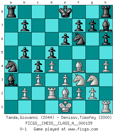 Last move : 0-1 2013 August 28 12:52:37 [Event "FICGS__CHESS__CLASS_A__000139"] [Site "FICGS"] [Date "2013.05.13"] [Round "1"] [White "Tanda,Giovanni"] [Black "Denisov,Timofey"] [Result "0-1"] [WhiteElo "2044"] [BlackElo "2000"] 1.d4 d5 2.Bf4 Nf6 3.e3 c5 4.c3 Qb6 5.Qb3 c4 6.Qxb6 axb6 7.Nd2 Bf5 8.Ngf3 h6 9.Be2 b5 10.a3 e6 11.Rd1 Nbd7 12.Nf1 Bh7 13.h4 Nb6 14.Ng3 Na4 15.Rd2 Bxa3 0-1 This chess game has been lost on time (started : 2013.05.13 15:52:56) Queen's pawn, Mason variation Player Black won this chess game. Follow this game move after move (download)Chess is like life. (Boris Spassky) Es tut gut, die Entwicklungsperiode von, [...] demokratischem Geist durchdringen zu lassen. Wie undemokratisch wäre es doch beispielsweise, den einen Offizier große Spaziertouren vornehmen zu lassen, während die anderen zu Hause säßen und sich entsetzlich langweilten. (Aaron Nimzowitsch) Aún el Rey más flojo huye despavorido ante la amenaza de un Jaque doble. (Aaron Nimzowitsch) Les échecs, c'est l'imagination. (David Bronstein) Political correctness is subjecting us to gross incompetence. (Johann Piek)