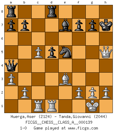 Last move : 1-0 2013 August 25 22:43:53 [Event "FICGS__CHESS__CLASS_A__000139"] [Site "FICGS"] [Date "2013.05.13"] [Round "1"] [White "Huerga,Aser"] [Black "Tanda,Giovanni"] [Result "1-0"] [WhiteElo "2124"] [BlackElo "2044"] 1.e4 c6 2.d4 d5 3.e5 c5 4.Nf3 Nc6 5.dxc5 Bg4 6.c3 e6 7.Be3 Bxf3 8.Qxf3 Nxe5 9.Bb5+ Nc6 10.O-O Nf6 11.c4 Be7 12.Nc3 O-O 13.Rfd1 Qa5 14.cxd5 Nxd5 15.Nxd5 exd5 16.Bd3 Rfd8 17.a3 Qa4 18.Rac1 Ne5 19.Bxh7+ Kxh7 20.Qh5+ 1-0 Caro-Kann : Advance variation Kingside Castling by player White (move 10) Kingside Castling by player Black (move 12) Player White won this chess game. Follow this game move after move (download)By the beauty of his games, the clarity of his play, and the brilliance of his ideas, Fischer made himself an artist of the same stature as Brahms, Rembrandt, and Shakespeare. (David Levy) Wer mein Gambit spielt, muß bereit sein, alle Brücken hinter sich abzubrechen. Es verändert den ganzen Menschen. Es wirkt wie ein Zauberstab und fördert verkümmerte, gute Charakter- eigenschaften wieder zu Tage. (Emil Joseph Diemer) A la fecha, Fischer esta simplemente un nivel arriba de todos los mejores jugadores de Ajedrez del mundo. (John Jacobs) En blitz, le Cavalier l'emporte sur le Fou. (Vlastimil Hort) CHESS, n. f. [echecs, Fr.] A nice and abstruse game, in which two sets of puppets are moved in opposition to each other. (Dr Samuel Johnson, A Dictionary Of The English Language, 1755)