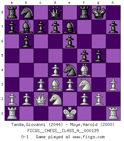 Last move : 0-1 2013 August 11 6:6:33 [Event "FICGS__CHESS__CLASS_A__000139"] [Site "FICGS"] [Date "2013.05.13"] [Round "1"] [White "Tanda,Giovanni"] [Black "Moye,Harold"] [Result "0-1"] [WhiteElo "2044"] [BlackElo "2000"] 1.d4 e6 2.Bf4 f5 3.e3 Nf6 4.Nf3 Be7 5.h3 O-O 6.Nbd2 b6 7.c3 Bb7 8.Bd3 Ne4 9.Qc2 g5 0-1 This chess game has been lost on time (started : 2013.05.13 15:52:56) Queen's pawn Kingside Castling by player Black (move 5) Player Black won this chess game. Follow this game move after move (download)The defensive power of a pinned piece is only imaginary. (Aaron Nimzovich) Der Schachmeister von Heute braucht Courage, einen Killerinstinkt, Ausdauer und Arroganz. (Larry Evans) De todos mis libros Rusos, la defensa contiene y difunde el 'calor' mas grande que pudiese verse extraño al observar lo supremamente abstracto que el Ajedrez supuestamente es. (Vladimir Nabokov) Je ne suis pas le dernier à jouer lâchement des coups douteux pendant le zeïtnot de l'adversaire pour l'achever: en effet les coups qui font le plus peur sont ceux que l'on ne comprend pas. Je me fais souvent peur quand je joue. (Un professeur anonyme) Life is like a game of cards: the hand you are dealt represents determinism; the way you play it is free will. (Jawaharlal Nehru)