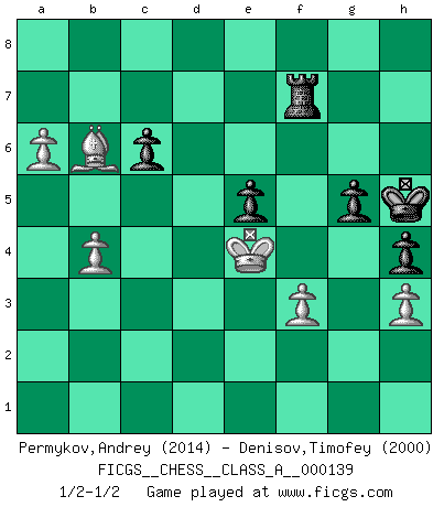 Last move : 1/2-1/2 2013 May 27 5:43:8 [Event "FICGS__CHESS__CLASS_A__000139"] [Site "FICGS"] [Date "2013.05.13"] [Round "1"] [White "Permykov,Andrey"] [Black "Denisov,Timofey"] [Result "1/2-1/2"] [WhiteElo "2014"] [BlackElo "2000"] 1.e4 e5 2.Nf3 Nf6 3.d4 Nxe4 4.Bd3 d5 5.Nxe5 Bd6 6.O-O O-O 7.c4 Bxe5 8.dxe5 Nc6 9.cxd5 Qxd5 10.Qc2 Nd4 11.Bxe4 Nxc2 12.Bxd5 Bf5 13.g4 Bxg4 14.Be4 Nxa1 15.Bf4 f6 16.Nd2 fxe5 17.Be3 c6 18.Rxa1 Bf5 19.a4 Rad8 20.Bxf5 Rxf5 21.Ne4 a6 22.Kg2 h6 23.Ra3 Rf7 24.Rb3 Kh7 25.h3 R8d7 26.Rb6 g5 27.b4 Kg6 28.Bc5 Kh5 29.a5 Kg6 30.Nd6 Rh7 31.Kf3 h5 32.Ke4 h4 33.f3 Kh5 34.Nxb7 Rxb7 35.Rxa6 Rbf7 36.Be3 Rb7 37.Rb6 Rxb6 38.Bxb6 Rf7 39.a6 1/2-1/2 Petrov : Modern attack, Trifunovic variation Kingside Castling by player White (move 6) Kingside Castling by player Black (move 6) This chess game ended in a draw. Follow this game move after move (download)When the Chess game is over, the Pawn and the King go back to the same box. (Irish saying) Ja, jede Frau in Holland liebt mich bestimmt, und alle Männer hassen mich. (Loek van Wely) Solo existe una cosa que Fischer hace en el Ajedrez sin placer: ¡perder!. (Boris Spassky) On peut tirer plus d'utilité d'une partie perdue que de 100 parties gagnées. (Capablanca) Man is still the most extraordinary computer of all. (John F. Kennedy)