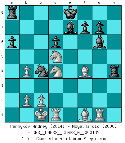 Last move : 1-0 2013 September 25 15:2:29 [Event "FICGS__CHESS__CLASS_A__000139"] [Site "FICGS"] [Date "2013.05.13"] [Round "1"] [White "Permykov,Andrey"] [Black "Moye,Harold"] [Result "1-0"] [WhiteElo "2014"] [BlackElo "2000"] 1.e4 c5 2.Nf3 d6 3.d4 cxd4 4.Nxd4 Nf6 5.Nc3 a6 6.Be3 e6 7.f3 b5 8.Qd2 Nbd7 9.g4 h6 10.O-O-O Ne5 11.Rg1 Bb7 12.h4 Qa5 13.g5 hxg5 14.hxg5 b4 15.Nb1 Nxe4 16.fxe4 Bxe4 17.g6 Bxg6 18.a3 Be7 19.axb4 Qa2 20.Qg2 Qd5 21.Qxd5 exd5 22.Nc3 Nc4 23.Bf4 Rh4 24.Nxd5 1-0 Sicilian : Najdorf, Byrne (English) attack Queenside Castling by player White (move 10) Player White won this chess game. Follow this game move after move (download)Avoid the crowd. Do your own thinking independently. Be the Chess player, not the Chess piece. (Ralph Charell) Ein guter Spieler hat immer Glück. (José Raúl Capablanca) El juego de Damas es para vagabundos. (Paul Morphy) Aux échecs, les retours au sommet sont rares : les dommages psychologiques consécutifs à une défaite sont trop sévères. (Daily Telegraph) Memory is a complicated thing, a relative to truth, but not its twin. (Barbara Kingsolver, Animal Dreams)
