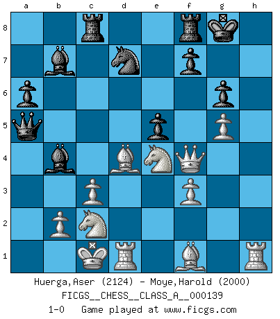 Last move : 1-0 2013 August 25 19:10:52 [Event "FICGS__CHESS__CLASS_A__000139"] [Site "FICGS"] [Date "2013.05.13"] [Round "1"] [White "Huerga,Aser"] [Black "Moye,Harold"] [Result "1-0"] [WhiteElo "2124"] [BlackElo "2000"] 1.e4 c5 2.Nf3 d6 3.d4 cxd4 4.Nxd4 Nf6 5.Nc3 a6 6.f3 e6 7.Be3 b5 8.Qd2 Nbd7 9.a3 Bb7 10.g4 h6 11.O-O-O Rc8 12.h4 d5 13.Rg1 dxe4 14.g5 hxg5 15.hxg5 Nd5 16.Nxe4 g6 17.Bf2 b4 18.axb4 Bxb4 19.c3 Qa5 20.Nc2 O-O 21.Bd4 e5 22.Rh1 Nf4 23.Qxf4 1-0 Sicilian : Najdorf Queenside Castling by player White (move 11) Kingside Castling by player Black (move 20) Player White won this chess game. Follow this game move after move (download)Chess is above all, a fight ! (Emanuel Lasker) Ich erzeugte keinen Neid, da mich die Schachspieler als Musiker und die Musiker als Schachspieler betrachteten. (Mark Taimanov) El Ajedrez hace al hombre ser mas sabio y ver mas claro. (Vladimir Putin) Les Cavaliers se révèlent fort utiles dans les positions fermées. D'habitude, les Fous sont un peu plus forts que les Cavaliers dans les positions ouvertes. Qu'on le veuille ou non, il restera toujours des exceptions ! No, no, you're not thinking; you're just being logical. (Niels Bohr)
