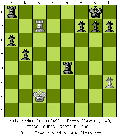 Last move : 0-1 2013 May 21 6:33:12 [Event "FICGS__CHESS__RAPID_E__000104"] [Site "FICGS"] [Date "2013.05.14"] [Round "1"] [White "Melquiades,Jay"] [Black "Bromo,Alexis"] [Result "0-1"] [WhiteElo "0849"] [BlackElo "1140"] 1.e4 e5 2.Nf3 Nc6 3.c3 Nf6 4.d3 Bc5 5.Be3 Bxe3 6.fxe3 d5 7.Nbd2 Bg4 8.h3 Bxf3 9.Qxf3 dxe4 10.Nxe4 Nxe4 11.dxe4 a6 12.Bc4 Qe7 13.O-O-O Na5 14.b3 Nxc4 15.bxc4 Qa3+ 16.Kc2 Qxa2+ 17.Kc1 Qxc4 18.Rd2 Qxc3+ 19.Kd1 Qa1+ 20.Ke2 Qxh1 21.Qf5 Qxg2+ 22.Kd1 Qg1+ 23.Kc2 O-O 24.Qxe5 Qxe3 25.Rd7 Rfe8 26.Qf5 Qxe4+ 27.Qxe4 Rxe4 28.Rxc7 b5 0-1 Ponziani : Jaenisch counter-attack Queenside Castling by player White (move 13) Kingside Castling by player Black (move 23) Player Black won this chess game. Follow this game move after move (download)The laws of Chess do not permit a free choice: you have to move whether you like it or not. (Emanuel Lasker) Die Fehler sind da, Sie warten nur darauf gemacht zu werden. (Savielly Grigorievitsch Tartakower) Hay dos clases de hombres: aquellos que se conforman en dejarse llevar por las circunstancias y que juegan barajas y aquellos decididos a controlar las circunstancias y que juegan al Ajedrez. (Mortimer Collins) Les Echecs ne sont pas pour les âmes timides. Ils requièrent un homme entier, qui ne s'arrête pas aveuglément à ce qui a été déjà établi, mais qui tente individuellement de sonder les profondeurs du jeu. (W. Steinitz) It is not enough to be a good player... you must also play well. (Siegbert Tarrasch)