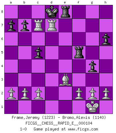 Last move : 1-0 2013 May 14 20:44:48 [Event "FICGS__CHESS__RAPID_E__000104"] [Site "FICGS"] [Date "2013.05.14"] [Round "1"] [White "Frame,Jeremy"] [Black "Bromo,Alexis"] [Result "1-0"] [WhiteElo "1223"] [BlackElo "1140"] 1.e4 e5 2.Nf3 Nc6 3.Bc4 h6 4.d4 exd4 5.Nxd4 Nxd4 6.Qxd4 c5 7.Qd5 Qe7 8.e5 d6 9.O-O dxe5 10.Re1 Nf6 11.Qxe5 Be6 12.Bxe6 fxe6 13.Qxe6 Qxe6 14.Rxe6+ Be7 15.Bf4 O-O-O 16.Nc3 Rhf8 17.Rxe7 Nd5 18.Nxd5 Rxd5 19.Be3 g5 20.Re1 Rdf5 21.Rd1 g4 22.R1d7 Re8 23.Rc7+ Kd8 24.Red7+ 1-0 King's pawn game Kingside Castling by player White (move 9) Queenside Castling by player Black (move 15) Player White won this chess game. Follow this game move after move (download)Chess opens and enriches your mind. (Saudin Robovic) Ich hatte Angst gegen einen russischen Großmeister zu verlieren, und er befürchtete gegen einen kleinen Jungen zu verlieren. (über ein Remis gegen Juri Awerbach). (Robert James Fischer) El ganar no lo es todo... pero el perder es nada. (Mednis) Horreur, mais aussi harmonie suprême : qu'y avait-il en effet au monde en dehors des échecs ? Le brouillard, l'inconnu, le non-être... (Vladimir Nabokov) Perception is reality. (Immanuel Kant)