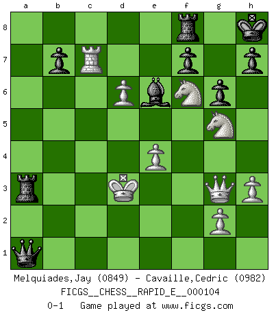Last move : 0-1 2013 May 23 16:18:28 [Event "FICGS__CHESS__RAPID_E__000104"] [Site "FICGS"] [Date "2013.05.14"] [Round "1"] [White "Melquiades,Jay"] [Black "Cavaille,Cedric"] [Result "0-1"] [WhiteElo "0849"] [BlackElo "0982"] 1.e4 e5 2.Nf3 Nc6 3.c3 Nf6 4.d3 Bc5 5.Be3 Bxe3 6.fxe3 Ng4 7.Qd2 Qe7 8.Be2 d6 9.c4 a5 10.Nc3 O-O 11.Nd5 Qd8 12.h3 Nf6 13.d4 Nxe4 14.Qc2 Ng3 15.Rg1 Qd7 16.Bd3 g6 17.O-O-O Qe6 18.Nxc7 Nb4 19.Qf2 Nxd3+ 20.Rxd3 Qxc4+ 21.Rc3 Qxa2 22.Kc2 Ra7 23.Qxg3 Qa4+ 24.Kd3 Qb4 25.Nd5 Qb5+ 26.Rc4 Qxb2 27.Nf6+ Kg7 28.Nh5+ Kh8 29.dxe5 Bf5+ 30.e4 Be6 31.Rc7 a4 32.Nf6 Kg7 33.Nh5+ Kh8 34.Rgc1 a3 35.Ng5 a2 36.exd6 a1Q 37.Rxa1 Qxa1 38.Nf6 Ra3+ 0-1 Ponziani : Jaenisch counter-attack Kingside Castling by player Black (move 10) Queenside Castling by player White (move 17) Promotion Queen by player Black (move 36) Player Black won this chess game. Follow this game move after move (download)You have to have the fighting spirit. You have to force moves and take chances. (Bobby Fischer) Wie kann ich Remis annehmen? Ich weiß ja gar nicht, wie ich stehe! (Fritz Sämisch) Bendita sea la memoria de aquel que dio al mundo este juego inmortal. (A. G. Gardiner) D'abord les bases : Jouez et étudiez, puis étudiez et jouez, ensuite jouez et étudiez, puis étudiez et jouez. Deuxièmement : Donnez toujours le meilleur de vous-même ! (Ken Smith) The problem with troubleshooting is that trouble shoots back. (Anonymous)