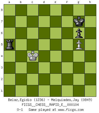 Last move : 0-1 2013 June 29 17:53:59 [Event "FICGS__CHESS__RAPID_E__000104"] [Site "FICGS"] [Date "2013.05.14"] [Round "1"] [White "Belaz,Egidio"] [Black "Melquiades,Jay"] [Result "0-1"] [WhiteElo "1236"] [BlackElo "0849"] 1.e4 e5 2.f4 exf4 3.Nf3 f6 4.d4 d5 5.e5 Bg4 6.exf6 Nxf6 7.Be2 Ne4 8.Bxf4 Bxf3 9.Bxf3 Bd6 10.Bxd6 Qxd6 11.O-O Ng5 12.Bg4 Nc6 13.Re1+ Ne4 14.Nc3 O-O 15.Nxe4 dxe4 16.Rxe4 Nxd4 17.Rxd4 Qb6 18.b3 Rad8 19.c3 c5 20.Rd2 c4 21.Kh1 h5 22.Bxh5 Rxd2 23.Qxd2 Rf2 24.Qd4 Qxd4 25.cxd4 c3 26.Rc1 c2 27.Kg1 Rd2 28.Kf1 a5 29.Bg6 Rd1+ 30.Ke2 Rxc1 31.Kd2 Rd1+ 32.Kxc2 Rxd4 33.h3 Rd6 34.Bf5 Rf6 35.g4 g6 36.Bd3 Rc6+ 37.Bc4+ Kg7 38.Kb2 a4 39.Kc3 b5 40.bxa4 Rxc4+ 41.Kb3 Rxa4 42.a3 Rf4 43.Kc3 Rf3+ 44.Kb4 Rxh3 45.g5 Rg3 46.Kxb5 Rxa3 47.Kc4 Ra5 0-1 King's knight's gambit Kingside Castling by player White (move 11) Kingside Castling by player Black (move 14) 10 pieces endgame at move 40 : White KBPPPP , Black KRPP WHITE : King + 1 Bishop 4 Pawns BLACK : King + 1 Rook 2 Pawns 9 pieces endgame at move 40 : White KPPPP , Black KRPP WHITE : King + 4 Pawns BLACK : King + 1 Rook 2 Pawns 8 pieces endgame at move 41 : White KPPP , Black KRPP WHITE : King + 3 Pawns BLACK : King + 1 Rook 2 Pawns 7 pieces endgame at move 44 : White KPP , Black KRPP WHITE : King + 2 Pawns BLACK : King + 1 Rook 2 Pawns 6 pieces endgame at move 46 : White KPP , Black KRP WHITE : King + 2 Pawns BLACK : King + 1 Rook 1 Pawn 5 pieces endgame at move 46 : White KP , Black KRP WHITE : King + 1 Pawn BLACK : King + 1 Rook 1 Pawn Player Black won this chess game. Follow this game move after move (download)A good player is always lucky. (Jose Raul Capablanca) Ein Schachgenie ist jemand der verdammt gut Schach spielt. (Jonathan Levitt) Hoy en día, si tu no eres un Gran Maestro a los 14 años, es mejor que lo olvides. (Anand Viswanathan) Il n'y a pas de prix trop élevé au scalp de l'ennemi. (Koblentz) All art requires courage. (Anne Tucker)