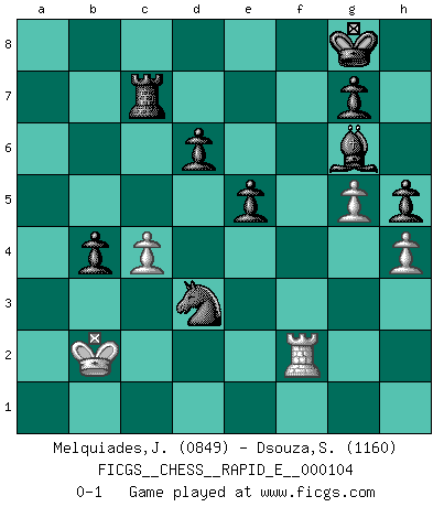 Last move : 0-1 2013 June 28 16:3:1 [Event "FICGS__CHESS__RAPID_E__000104"] [Site "FICGS"] [Date "2013.05.14"] [Round "1"] [White "Melquiades,Jay"] [Black "Dsouza,Stanislaus"] [Result "0-1"] [WhiteElo "0849"] [BlackElo "1160"] 1.e4 e5 2.Nf3 d6 3.Nc3 Be6 4.d4 Nd7 5.d5 Bg4 6.h3 Bh5 7.g4 Bg6 8.Bg5 Be7 9.Bxe7 Qxe7 10.Qd2 Ngf6 11.Ng5 h6 12.Nf3 Nc5 13.Bb5+ Nfd7 14.a4 a6 15.O-O-O axb5 16.b3 bxa4 17.bxa4 Nxa4 18.Nb5 O-O 19.Na3 Nac5 20.Nc4 Nxe4 21.Qe3 Ra1+ 22.Kb2 Rxd1 23.Rxd1 Ndc5 24.Nfd2 Nxd2 25.Rxd2 Ra8 26.f4 f6 27.fxe5 fxe5 28.Na3 Na4+ 29.Kb3 c6 30.g5 h5 31.h4 b5 32.Rf2 Nc5+ 33.Kb2 Qa7 34.Kb1 b4 35.dxc6 Qxa3 36.Qxa3 Rxa3 37.c7 Ra8 38.Kc1 Rc8 39.c4 Rxc7 40.Kb2 Nd3+ 0-1 Philidor's defense Queenside Castling by player White (move 15) Kingside Castling by player Black (move 18) Player Black won this chess game. Follow this game move after move (download)When you play Bobby, it is not a question if you win or lose. It is a question if you survive. (Boris Spassky) Es gibt zwei Arten von Opfern: Korrekte und meine. (Mikhail Nekhemyevich Tal) Es el objetivo de la escuela moderna no tratar cada posición de acuerdo a una regla general, sino de acuerdo al principio inherente en la posición. (Richard Reti) Je ne crois pas en la psychologie, je crois aux bons coups. (Robert Fischer) No, I am still playing. (Anatoly Karpov)