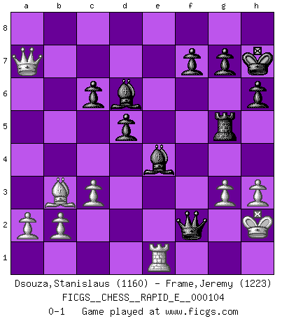 Last move : 0-1 2013 June 16 12:56:54 [Event "FICGS__CHESS__RAPID_E__000104"] [Site "FICGS"] [Date "2013.05.14"] [Round "1"] [White "Dsouza,Stanislaus"] [Black "Frame,Jeremy"] [Result "0-1"] [WhiteElo "1160"] [BlackElo "1223"] 1.e4 e5 2.Nf3 Nf6 3.Nxe5 d6 4.Nf3 Nxe4 5.Bc4 d5 6.Bb3 Bc5 7.O-O O-O 8.d3 Nf6 9.Bd2 c6 10.Nc3 Bf5 11.h3 Re8 12.Re1 Nbd7 13.Bg5 h6 14.Rxe8+ Qxe8 15.Bh4 Qf8 16.d4 Be7 17.Bg3 Re8 18.Ne5 Nxe5 19.dxe5 Nd7 20.Qf3 Bh7 21.Kh2 Bb4 22.Ne2 Nxe5 23.Bxe5 Rxe5 24.Nd4 Qe7 25.c3 Bd6 26.g3 Be4 27.Qg4 Rg5 28.Qc8+ Kh7 29.Re1 Qf6 30.Nf5 Bxf5 31.Qxb7 Be4 32.Qxa7 Qxf2+ 0-1 Petrov's defense Kingside Castling by player White (move 7) Kingside Castling by player Black (move 7) Player Black won this chess game. Follow this game move after move (download)Chess, like love, is infectious at any age. (Flohr) Den Ruhm habe ich schon, jetzt brauche ich noch das Geld. (Wilhelm Steinitz) El Ajedrez es el gimnasio de la mente. (Blaise Pascal) La vérité est comme le meilleur coup aux échecs : elle existe, mais il faut la chercher. (Arturo Perez-Reverte) O divine art of subtlety and secrecy! Through you we learn to be invisible, through you inaudible and hence we can hold the enemy's fate in our hands. (Sun Tzu)