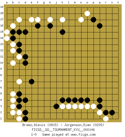 Last move : 1-0 2013 July 21 3:47:44 [Event "FICGS__GO__TOURNAMENT_KYU__000146"] [Site "FICGS"] [Date "2013.05.15"] [Round "1"] [Black "Bromo,Alexis"] [White "Jorgenson,Evan"] [Result "1-0"] [Rating 1 "0815"] [Rating 2 "0205"] 1.q16 e17 2.d4 c7 3.d10 b10 4.e7 c11 5.q4 o18 6.p17 n17 7.k15 k17 8.h16 h17 9.f16 f17 10.d15 c17 11.c13 b13 12.b14 b12 13.c12 b16 14.c15 a15 15.b15 a14 16.d11 b5 17.c5 b3 18.c3 b4 19.c4 k3 20.k4 c2 21.d2 b2 22.j3 l3 23.l4 m3 24.m4 n3 25.n4 o3 26.o4 p3 27.q3 q2 28.r2 r1 29.s2 c1 30.d1 1-0 This go game has been lost on time (started : 2013.05.15 15:13:3) Here are the names of the openings (joseki) played in the four corners : Corner d4 : d4 c7 Hoshi (Hwajeom, Seongjeom, Xingwei`) 4-4 Point. The star or hoshi (4-4) point, emphasizing influence at the potential expense of territory. Niken Kakari (Dukan Keolch'im, E`r Gua`jiao~, 2-Space Low Approach). Black typically answers by 7-3 or 3-5 (which is not joseki). Corner q16 : q16 o18 Hoshi (Hwajeom, Seongjeom, Xingwei`) 4-4 Point. The star or hoshi (4-4) point, emphasizing influence at the potential expense of territory. Corner q4 : q4 l3 Hoshi (Hwajeom, Seongjeom, Xingwei`) 4-4 Point. The star or hoshi (4-4) point, emphasizing influence at the potential expense of territory. Player Black won this Go (weiqi, baduk) game. Follow this game move after move (download)With only one group, you will win. (Anonymous) The age of a woman doesn't mean a thing. The best tunes are played on the oldest fiddles. (Ralph Waldo Emerson)