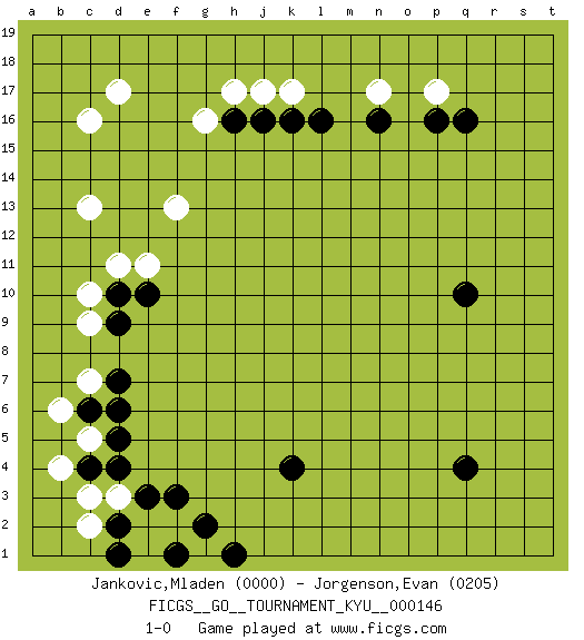 Last move : 1-0 2013 September 4 13:19:5 [Event "FICGS__GO__TOURNAMENT_KYU__000146"] [Site "FICGS"] [Date "2013.05.15"] [Round "1"] [Black "Jankovic,Mladen"] [White "Jorgenson,Evan"] [Result "1-0"] [Rating 1 "0000"] [Rating 2 "0205"] 1.d4 c16 2.q16 k17 3.q4 c9 4.k4 b6 5.q10 b4 6.d10 c10 7.d9 c3 8.d5 d3 9.e3 e2 10.f3 f2 11.g2 g1 12.h1 d17 13.k16 j17 14.j16 c13 15.d7 c7 16.c6 c5 17.f1 e1 18.d2 c2 19.d1 n17 20.n16 p17 21.p16 g16 22.h16 h17 23.l16 f13 24.d6 e11 25.e10 d11 26.c4 1-0 This go game has been lost on time (started : 2013.05.15 15:13:3) Here are the names of the openings (joseki) played in the four corners : Corner d4 : d4 c9 Hoshi (Hwajeom, Seongjeom, Xingwei`) 4-4 Point. The star or hoshi (4-4) point, emphasizing influence at the potential expense of territory. Corner q16 : q16 n17 Hoshi (Hwajeom, Seongjeom, Xingwei`) 4-4 Point. The star or hoshi (4-4) point, emphasizing influence at the potential expense of territory. Niken Kakari (Dukan Keolch'im, E`r Gua`jiao~, 2-Space Low Approach). Black typically answers by 7-3 or 3-5 (which is not joseki). Player Black won this Go (weiqi, baduk) game. Follow this game move after move (download)You have to like to win, and to learn to recognize the errors that gave you the victory. (Pierre Audouard) For peace of mind, resign as general manager of the universe. (Douglas Adams)