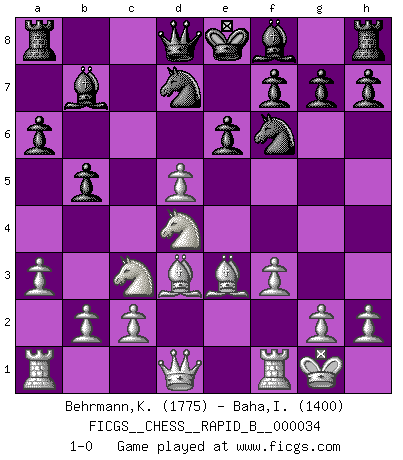 Last move : 1-0 2007 April 5 9:57:6 [Event "FICGS__CHESS__RAPID_B__000034"] [Site "FICGS"] [Date "2007.01.31"] [Round "1"] [White "Behrmann,Klaus"] [Black "Baha,Ioana-Karina"] [Result "1-0"] [WhiteElo "1775"] [BlackElo "1400"] 1.e4 c5 2.Nf3 d6 3.d4 cxd4 4.Nxd4 Nf6 5.Nc3 e6 6.Be3 a6 7.Bd3 b5 8.O-O Bb7 9.f3 Nbd7 10.a3 d5 11.exd5 1-0 This chess game has been lost on time (started : 2007.01.31 0:54:53) Sicilian : Scheveningen variation Kingside Castling by player White (move 8) Player White won this chess game. Follow this game move after move (download)Many have become Chess Masters, no one has become the Master of Chess. (Siegbert Tarrasch) Mein Name ist Rustam Kamsky. Sie haben meinen Sohn belästigt. Bereiten Sie sich aufs Sterben vor. (Rustam Kamsky) Realmente no sabemos como el juego fue inventado, aunque hay sospechas. Tan pronto como descubramos a los culpables, se los haremos saber. (Bruce Pandolfini) Des points faibles ou des trous dans la position de l'adversaire doivent être occupés par des pièces et non pas par des pions. (Siegbert Tarrasch) Life is like a ten-speed bicycle: most of us have gears we never use. (Charles M. Schulz)