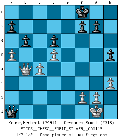 Last move : 1/2-1/2 2013 June 4 12:51:42 [Event "FICGS__CHESS__RAPID_SILVER__000119"] [Site "FICGS"] [Date "2013.05.17"] [Round "1"] [White "Kruse,Herbert"] [Black "Germanes,Ramil"] [Result "1/2-1/2"] [WhiteElo "2491"] [BlackElo "2315"] 1.e4 e5 2.Nf3 Nf6 3.Nxe5 d6 4.Nf3 Nxe4 5.d4 d5 6.Bd3 Nc6 7.O-O Be7 8.c4 Nb4 9.Be2 O-O 10.Nc3 Bf5 11.a3 Nxc3 12.bxc3 Nc6 13.Re1 Re8 14.cxd5 Qxd5 15.Bf4 Rac8 16.Bd3 Qd7 17.Rb1 b6 18.d5 Bxd3 19.Qxd3 Bf6 20.c4 Ne7 21.h3 Ng6 22.Bg3 h5 23.Rbd1 Re7 24.Rxe7 Bxe7 25.Re1 Re8 26.Qe3 Kf8 27.Qb3 Bd6 28.Rxe8+ Qxe8 29.Bxd6+ cxd6 30.Qb4 Qe7 31.a4 Ne5 32.Nxe5 Qxe5 33.a5 Qa1+ 34.Kh2 Qe5+ 35.Kg1 Qa1+ 36.Kh2 Qe5+ 37.Kg1 Qa1+ 1/2-1/2 Petrov : Classical attack Kingside Castling by player White (move 7) Kingside Castling by player Black (move 9) This chess game ended in a draw. Follow this game move after move (download)Avoid the crowd. Do your own thinking independently. Be the Chess player, not the Chess piece. (Ralph Charell) Der 70jährige Viktor Kortschnoi: Die Rentenanstalt wollte mich zwingen in Rente zu gehen. Meine Frau erhält jetzt eine Pension- und ich zahle weiter in die Rentenkasse ein! (Viktor Kortschnoi) ¿Se han dado cuenta de que Fischer casi nunca ha tenido piezas malas? El las intercambia y las piezas malas se quedan con sus oponenets. (Yuri Balashov) Il n'y a pas eu de défaite parce que je ne crois pas que cet ordinateur ait jamais existé. IBM a triché en refusant d'imprimer les modes de recherche de la machine. C'est évident, pendant le match, des coups décisifs ont été joués par des êtres humains. Aujourd'hui, les meilleurs spécialistes en informatique ne peuvent toujours pas expliquer comment Deep-Blue a pu jouer contre la logique des ordinateurs. IBM a gagné une guerre de communication, mais ils sont incapables de prouver que l'ordinateur a gagné tout seul. (Garry Kasparov) How many people work in NATO Headquarters ? - About half of them. (Dirk Stikker, NATO general secretary)