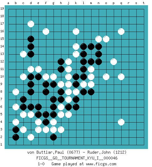 Last move : 1-0 2013 October 7 3:22:40 [Event "FICGS__GO__TOURNAMENT_KYU_I__000046"] [Site "FICGS"] [Date "2013.05.17"] [Round "1"] [Black "von Buttlar,Paul"] [White "Ruder,John"] [Result "1-0"] [Rating 1 "0677"] [Rating 2 "1212"] 1.d15 q4 2.k10 q16 3.d4 f3 4.f4 g4 5.g5 e4 6.f5 e3 7.e5 d5 8.d3 h3 9.d6 c5 10.g2 g3 11.e6 d2 12.c4 b4 13.b3 c3 14.b2 b8 15.d8 c10 16.c6 b6 17.c7 h5 18.g6 h6 19.g7 c13 20.d9 e11 21.d10 d11 22.e10 f10 23.f9 g10 24.g9 h9 25.h8 j8 26.h7 j7 27.f8 j10 28.j6 j5 29.k6 q10 30.k7 k8 31.l8 l9 32.k9 j9 33.l10 m9 34.h11 j11 35.m8 m10 36.l11 m11 37.l12 k13 38.m12 o10 39.n12 p12 40.l13 k14 41.l14 k16 42.m14 n15 43.n14 o15 44.n13 j12 45.h12 d17 46.d14 f16 47.d13 1-0 This go game has been lost on time (started : 2013.05.17 12:39:31) Here are the names of the openings (joseki) played in the four corners : Corner d4 : d4 f3 Hoshi (Hwajeom, Seongjeom, Xingwei`) 4-4 Point. The star or hoshi (4-4) point, emphasizing influence at the potential expense of territory. Ikken Kakari (Hankan Keolch'im, Yi Gua`jiao~, 1-Space Low Approach). White 2 is the standard approach move to the 4-4. Corner d16 : d15 c13 Takamoku (Gomok, Gaomu`) 5-4 Point. The takamoku (high) point (5-4). With its emphasis on influence, the 5-4 point complements the 4-4 (hoshi) point in creating an influence-oriented fuseki. Corner q4 : q4 l8 Hoshi (Hwajeom, Seongjeom, Xingwei`) 4-4 Point. The star or hoshi (4-4) point, emphasizing influence at the potential expense of territory. Corner q16 : q16 l11 Hoshi (Hwajeom, Seongjeom, Xingwei`) 4-4 Point. The star or hoshi (4-4) point, emphasizing influence at the potential expense of territory. Player Black won this Go (weiqi, baduk) game. Follow this game move after move (download)Go is to western chess what philosophy is to double entry accounting. (from Shibumi, by Trevanian) For a mechanic, you seem to do an excessive amount of thinking. (C-3PO in Star Wars ep.2)
