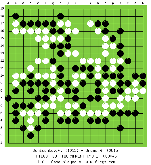 Last move : 1-0 2013 May 25 7:9:38 [Event "FICGS__GO__TOURNAMENT_KYU_I__000046"] [Site "FICGS"] [Date "2013.05.17"] [Round "1"] [Black "Denisenkov,Valentin"] [White "Bromo,Alexis"] [Result "1-0"] [Rating 1 "1092"] [Rating 2 "0815"] 1.q16 d4 2.q3 d16 3.f4 k10 4.d10 k16 5.r9 p9 6.q11 o13 7.o11 n10 8.o10 o9 9.n9 m9 10.n8 o8 11.n7 o7 12.m10 n11 13.l9 m8 14.m7 l8 15.k8 l7 16.l6 k9 17.k7 l10 18.m11 n12 19.c6 c5 20.d6 d5 21.c3 d3 22.d2 e12 23.e3 e5 24.f5 e6 25.e7 f6 26.f7 g6 27.j4 g7 28.g8 h8 29.f9 g9 30.f8 h7 31.h9 g10 32.h10 f10 33.h11 g11 34.j9 d7 35.d8 c7 36.b6 c8 37.e9 e10 38.c9 b7 39.a7 d11 40.b4 c10 41.d9 b9 42.b8 b10 43.j8 j6 44.k5 h5 45.h4 j5 46.b5 k6 47.k11 m12 48.l11 l12 49.j14 j13 50.h13 k13 51.g12 f12 52.c17 c16 53.d17 b17 54.b18 b16 55.e17 e16 56.f17 f16 57.g16 g15 58.h16 h15 59.j15 j16 60.f15 f14 61.g14 e15 62.h14 f15 63.h18 h17 64.g17 j17 65.o17 n16 66.n17 m17 67.o16 o15 68.p15 o14 69.q13 p14 70.q14 p12 71.q10 p11 72.p10 q12 73.r12 o6 74.q5 q6 75.q8 q7 76.p5 p6 77.p8 o5 78.o4 r7 79.r5 r8 80.q9 s9 81.s10 s7 82.t9 s8 83.s5 t8 84.t10 n5 85.n4 m5 86.m4 l5 87.k4 1-0 Here are the names of the openings (joseki) played in the four corners : Corner d4 : d4 f4 Hoshi (Hwajeom, Seongjeom, Xingwei`) 4-4 Point. The star or hoshi (4-4) point, emphasizing influence at the potential expense of territory. Ikken Takagakari (Hankan Nop'dakeolch'im, Yi Gaojia, 1-Space High Approach). White typically responds at 6-4 or 3-10. White 4-10 is played when White finds play on the right side advantageous. White 4-8 or 3-8 may be played when White has support at top. Player Black won this Go (weiqi, baduk) game. Follow this game move after move (download)You can hide nothing on the goban. (Pierre Audouard) Life is like a ten-speed bicycle: most of us have gears we never use. (Charles M. Schulz)