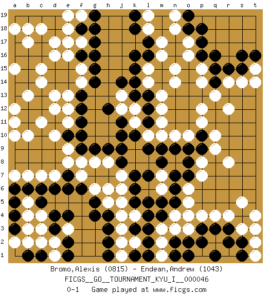 Last move : 0-1 2013 July 7 10:7:1 [Event "FICGS__GO__TOURNAMENT_KYU_I__000046"] [Site "FICGS"] [Date "2013.05.17"] [Round "1"] [Black "Bromo,Alexis"] [White "Endean,Andrew"] [Result "0-1"] [Rating 1 "0815"] [Rating 2 "1043"] 1.q16 d16 2.d4 q4 3.k10 q10 4.l4 d10 5.k16 r14 6.p10 p11 7.p9 q9 8.e10 e11 9.f11 e12 10.f12 e13 11.f13 f14 12.g14 f15 13.g15 e9 14.f10 e8 15.e7 d7 16.d6 f7 17.e6 g8 18.h9 h8 19.j8 j7 20.k7 j6 21.k6 j5 22.k5 j4 23.g5 g6 24.f6 h6 25.g9 o16 26.p16 p15 27.q15 p14 28.q14 q13 29.r15 s14 30.s15 o17 31.p17 n15 32.m15 n14 33.m14 m13 34.l13 m12 35.l12 m11 36.l11 m10 37.m9 o10 38.o9 n10 39.n9 o3 40.f16 e16 41.e17 f17 42.g16 d17 43.g17 e18 44.f18 e17 45.g18 m16 46.l16 m17 47.l17 c3 48.d3 c4 49.c5 b5 50.c6 c7 51.b6 b7 52.a6 d2 53.e2 d1 54.e1 b2 55.a5 b4 56.a4 a2 57.a3 b3 58.c1 p8 59.o8 p7 60.o7 o6 61.n6 o5 62.n5 n4 63.m4 m3 64.l3 m2 65.l2 m1 66.l1 k4 67.f9 f8 68.h4 h5 69.g4 l18 70.k18 l19 71.k19 n18 72.p18 p12 73.o18 n19 74.o19 j3 75.h3 j2 76.h2 j1 77.h1 a7 78.l5 f19 79.g19 e19 80.b14 c14 81.b15 c15 82.c13 d13 83.c12 c11 84.b11 b10 85.b16 b17 86.a17 a18 87.a16 c18 88.a14 a11 89.b12 a12 90.a13 a10 91.c16 d12 92.c17 b18 93.r3 r4 94.s4 s5 95.q3 s3 96.s2 t4 97.p3 p4 98.o2 n3 99.p2 t2 100.s1 t3 101.o1 t1 102.q1 e3 103.e4 t15 104.t16 t14 105.s16 r12 106.r2 l10 107.l9 k2 108.k1 r8 109.k3 m6 110.n7 m7 111.m5 k11 112.j11 k12 113.k13 c2 114.b1 j12 115.h12 j13 116.j14 l14 117.k14 l15 118.k15 k9 119.j10 k8 120.j9 l8 121.m8 b13 122.l7 a15 123.n2 o4 124.n1 pass 0-1 Here are the names of the openings (joseki) played in the four corners : Corner q4 : q4 l4 Hoshi (Hwajeom, Seongjeom, Xingwei`) 4-4 Point. The star or hoshi (4-4) point, emphasizing influence at the potential expense of territory. Corner q16 : q16 r14 Hoshi (Hwajeom, Seongjeom, Xingwei`) 4-4 Point. The star or hoshi (4-4) point, emphasizing influence at the potential expense of territory. Ikken Kakari (Hankan Keolch'im, Yi Gua`jiao~, 1-Space Low Approach). White 2 is the standard approach move to the 4-4. Corner d4 : d4 e9 Hoshi (Hwajeom, Seongjeom, Xingwei`) 4-4 Point. The star or hoshi (4-4) point, emphasizing influence at the potential expense of territory. Player White won this Go (weiqi, baduk) game. Follow this game move after move (download)Learn the eye-stealing tesuji. (Anonymous) Wisdom begins at the end. (Daniel Webster)
