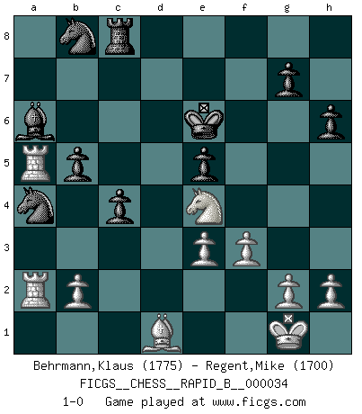Last move : 1-0 2007 April 13 16:33:8 [Event "FICGS__CHESS__RAPID_B__000034"] [Site "FICGS"] [Date "2007.01.31"] [Round "1"] [White "Behrmann,Klaus"] [Black "Regent,Mike"] [Result "1-0"] [WhiteElo "1775"] [BlackElo "1700"] 1.d4 d5 2.c4 dxc4 3.Nf3 Nf6 4.Nc3 c6 5.Ne5 b5 6.a4 a6 7.axb5 cxb5 8.Nxb5 axb5 9.Rxa8 Bb7 10.Ra7 Qb6 11.Ra1 e6 12.e3 Bb4+ 13.Bd2 Bxd2+ 14.Qxd2 O-O 15.Qa5 Nfd7 16.Qxb6 Nxb6 17.Ra5 Ba6 18.Be2 f6 19.Nf3 Rc8 20.Nd2 e5 21.dxe5 fxe5 22.Ne4 Kf8 23.O-O Ke7 24.Rfa1 Na4 25.Ra2 h6 26.f3 Ke6 27.Bd1 1-0 QGA, 4.Nc3 Kingside Castling by player Black (move 14) Kingside Castling by player White (move 23) Player White won this chess game. Follow this game move after move (download)With or without the title, Bobby Fischer was unquestionably the greatest player of his time. (Burt Hochberg) Ich verachte die Medien. (Robert James Fischer) En manos de Fischer's, una diminuta ventaja teórica es tan buena como tener una Reina de ventaja. (Isaac Kashdan) Pour se monter efficace, un Cavalier a besoin d'avant-postes ! Les Cavaliers font les meilleurs bloqueurs de pions passés. The human is the only animal species whose members are able to talk themselves into difficulties that would not otherwise exist. (Wendell Johnson)