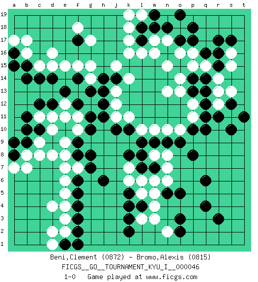 Last move : 1-0 2013 July 1 21:16:45 [Event "FICGS__GO__TOURNAMENT_KYU_I__000046"] [Site "FICGS"] [Date "2013.05.17"] [Round "1"] [Black "Beni,Clement"] [White "Bromo,Alexis"] [Result "1-0"] [Rating 1 "0872"] [Rating 2 "0815"] 1.q16 d4 2.q4 d16 3.f3 e3 4.f4 e4 5.f5 e5 6.l4 k16 7.q10 d10 8.k10 n13 9.f17 g17 10.c14 c15 11.d14 d15 12.c12 e12 13.c10 c9 14.d9 c11 15.b10 c8 16.b11 d11 17.f14 f15 18.g13 g14 19.e13 e15 20.f12 f11 21.g11 f10 22.q6 o16 23.o17 n17 24.p17 p16 25.r17 q15 26.r15 r14 27.q14 p15 28.q13 r13 29.q12 r12 30.r11 s15 31.r16 s16 32.s17 s11 33.s10 o18 34.n16 n15 35.n18 m17 36.m18 m16 37.l18 k17 38.p18 k18 39.f6 e6 40.s12 s13 41.t11 l19 42.b15 b16 43.b14 f18 44.g10 e9 45.f8 d8 46.r3 p11 47.q11 p12 48.p10 o10 49.o9 n10 50.n9 m10 51.m9 l10 52.l9 k11 53.j10 j11 54.f2 e2 55.f9 e8 56.a16 a17 57.a15 b17 58.e1 d1 59.f1 d2 60.h14 g15 61.h13 j13 62.j14 k14 63.h12 j12 64.p13 o13 65.b9 b8 66.d12 e11 67.a8 a7 68.a9 b7 69.h11 j15 70.p14 o14 71.l17 l16 72.o19 k19 73.m19 f7 74.g7 e7 75.g8 l3 76.k3 m3 77.k2 m4 78.k4 m5 79.o3 n6 80.m7 n7 81.o5 n2 82.o2 l5 83.n5 m6 84.l7 k6 85.k5 l6 86.h6 k7 87.k8 m8 88.l8 n8 89.p8 1-0 Here are the names of the openings (joseki) played in the four corners : Corner d4 : d4 f3 Hoshi (Hwajeom, Seongjeom, Xingwei`) 4-4 Point. The star or hoshi (4-4) point, emphasizing influence at the potential expense of territory. Ikken Kakari (Hankan Keolch'im, Yi Gua`jiao~, 1-Space Low Approach). Black 2 is the standard approach move to the 4-4. Corner q16 : q16 n13 Hoshi (Hwajeom, Seongjeom, Xingwei`) 4-4 Point. The star or hoshi (4-4) point, emphasizing influence at the potential expense of territory. Corner d16 : d16 f17 Hoshi (Hwajeom, Seongjeom, Xingwei`) 4-4 Point. The star or hoshi (4-4) point, emphasizing influence at the potential expense of territory. Ikken Kakari (Hankan Keolch'im, Yi Gua`jiao~, 1-Space Low Approach). Black 2 is the standard approach move to the 4-4. Player Black won this Go (weiqi, baduk) game. Follow this game move after move (download)Grab the border points between two moyos. (Anonymous) It's unlucky to be superstitious. (Dave Enteles)
