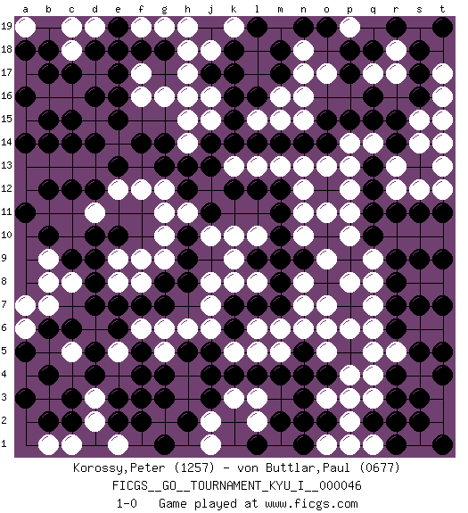 Last move : 1-0 2014 January 26 19:58:25 [Event "FICGS__GO__TOURNAMENT_KYU_I__000046"] [Site "FICGS"] [Date "2013.05.17"] [Round "1"] [Black "Korossy,Peter"] [White "von Buttlar,Paul"] [Result "1-0"] [Rating 1 "1257"] [Rating 2 "0677"] 1.q16 q4 2.d4 k10 3.d16 o13 4.k4 k5 5.m4 m5 6.n5 m6 7.o4 n6 8.j5 l5 9.l4 j6 10.h5 o6 11.q10 p4 12.r6 q6 13.r7 q7 14.r4 r5 15.s5 o5 16.n4 p6 17.r3 q5 18.q13 q8 19.r8 q9 20.r9 o3 21.n3 n2 22.o2 p3 23.m2 p8 24.d10 o7 25.k16 p2 26.n1 p1 27.q2 p10 28.q11 p11 29.m12 o9 30.m10 o1 31.n2 j4 32.j3 h4 33.g4 h3 34.h2 g3 35.f3 g2 36.g1 h6 37.f2 r10 38.q12 p12 39.m8 n8 40.l7 l6 41.k7 l8 42.l9 k8 43.m7 m9 44.n9 k9 45.m11 l10 46.m9 n7 47.k6 j7 48.h9 m13 49.k12 j8 50.g8 r2 51.s2 g6 52.e7 g9 53.h8 f8 54.f7 j10 55.h10 h11 56.h12 g11 57.j11 g10 58.g7 f6 59.e6 l13 60.l12 k13 61.j13 g5 62.f5 s10 63.s9 t10 64.t9 q1 65.r1 s6 66.s7 t6 67.t5 q3 68.r2 s4 69.t7 q14 70.r14 p14 71.r15 r13 72.s11 r12 73.r11 p13 74.n14 n13 75.o15 n12 76.j14 o11 77.m14 n11 78.l14 n10 79.p15 s12 80.t11 t12 81.q15 s14 82.c14 s15 83.s16 t16 84.t15 t14 85.s17 t17 86.s18 n15 87.o14 g12 88.f14 f12 89.d12 e12 90.e10 e8 91.d8 f9 92.d7 c8 93.c9 b8 94.b6 n16 95.k14 m15 96.m17 n17 97.m18 n18 98.l16 m16 99.k18 q17 100.p17 o17 101.p18 p19 102.q18 j16 103.j17 h16 104.g18 g16 105.e17 f16 106.e15 f17 107.f18 h18 108.g13 d13 109.c12 c13 110.b14 b13 111.b12 b9 112.b10 a12 113.a11 a13 114.e13 a15 115.a14 b7 116.c6 a6 117.a5 a7 118.b4 d11 119.d14 b15 120.b17 t2 121.s3 t3 122.t4 r17 123.o19 s19 124.r19 j18 125.n19 j15 126.pass d3 127.c2 c16 128.c17 c18 129.d18 c19 130.b18 b3 131.c3 d2 132.pass c1 133.b2 e1 134.e3 a4 135.a3 h14 136.g14 h15 137.h13 h17 138.k17 l2 139.pass d19 140.pass b1 141.e2 l3 142.pass pass 143.pass j1 144.pass pass 145.pass j2 146.pass k3 147.l1 h3 148.j4 h4 149.g3 e9 150.d9 e5 151.f4 l15 152.k15 a17 153.pass g19 154.e19 s1 155.t1 b16 156.c15 a19 157.a16 h19 158.e16 k19 159.l19 f19 160.e18 c5 161.d5 r18 162.t19 t15 163.s13 t13 164.pass pass 165.pass b16 166.a18 c16 167.b15 1-0 Here are the names of the openings (joseki) played in the four corners : Corner q16 : q16 o13 Hoshi (Hwajeom, Seongjeom, Xingwei`) 4-4 Point. The star or hoshi (4-4) point, emphasizing influence at the potential expense of territory. Corner q4 : q4 m4 Hoshi (Hwajeom, Seongjeom, Xingwei`) 4-4 Point. The star or hoshi (4-4) point, emphasizing influence at the potential expense of territory. Corner d16 : d16 h11 Hoshi (Hwajeom, Seongjeom, Xingwei`) 4-4 Point. The star or hoshi (4-4) point, emphasizing influence at the potential expense of territory. Player Black won this Go (weiqi, baduk) game. Follow this game move after move (download)There is no territory in the centre. (Anonymous) If I had no sense of humor, I would long ago have committed suicide. (Mahatma Gandhi)