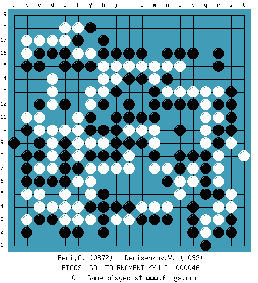 Last move : 1-0 2013 June 29 21:46:7 [Event "FICGS__GO__TOURNAMENT_KYU_I__000046"] [Site "FICGS"] [Date "2013.05.17"] [Round "1"] [Black "Beni,Clement"] [White "Denisenkov,Valentin"] [Result "1-0"] [Rating 1 "0872"] [Rating 2 "1092"] 1.r16 d4 2.d16 r4 3.p16 d14 4.c12 f16 5.e15 c17 6.f15 d17 7.c16 g16 8.e16 e17 9.g15 c10 10.e12 e10 11.h16 b16 12.b15 b17 13.h17 q10 14.p4 n4 15.q7 q3 16.o7 r13 17.n16 j3 18.p12 r8 19.c6 c5 20.d6 d8 21.c3 c4 22.d3 e4 23.f2 b3 24.b2 e3 25.e2 f6 26.p3 r7 27.r5 s5 28.q5 r6 29.n6 o5 30.q6 o6 31.n3 m4 32.p2 p7 33.p8 p6 34.q8 n7 35.o8 m7 36.m3 l4 37.o10 m9 38.e7 f8 39.f7 g7 40.g8 g6 41.e8 f9 42.c9 d9 43.c8 d7 44.b10 c7 45.l11 h14 46.h12 h15 47.k16 d13 48.c15 b9 49.b8 b11 50.a9 c11 51.b7 d12 52.f17 f18 53.g18 e18 54.e6 b5 55.b6 g9 56.h8 h9 57.l3 k3 58.r9 q9 59.r12 g13 60.r10 r11 61.s11 q11 62.s13 q12 63.s12 q13 64.r15 p13 65.o12 o13 66.n12 o15 67.o16 m14 68.s3 s4 69.r2 q2 70.q1 r3 71.s2 s9 72.s10 t8 73.k14 l13 74.j13 k13 75.k12 l12 76.k11 k15 77.m12 j14 78.e9 d10 79.f5 e5 80.h5 g5 81.h3 h4 82.g4 f4 83.j4 g3 84.h4 f3 85.h2 h7 86.j8 j7 87.k9 k8 88.j9 k7 89.k4 l10 90.m11 k10 91.j10 h11 92.g11 f11 93.j11 g12 94.g10 f10 95.h10 h13 96.n14 n13 97.m13 m15 98.l14 n15 99.l16 l15 100.j16 j15 101.l9 m10 102.m8 1-0 Here are the names of the openings (joseki) played in the four corners : Corner d16 : d16 d14 Hoshi (Hwajeom, Seongjeom, Xingwei`) 4-4 Point. The star or hoshi (4-4) point, emphasizing influence at the potential expense of territory. Ikken Takagakari (Hankan Nop'dakeolch'im, Yi Gaojia, 1-Space High Approach). Black typically responds at 6-4 or 3-10. Black 4-10 is played when Black finds play on the right side advantageous. Black 4-8 or 3-8 may be played when Black has support at top. Corner q4 : r4 p4 Komoku (Somok, Xiao~mu`) 3-4 Point. The komoku (3-4) point is the traditional corner enclosure move.. Ikken Takagakari (Hankan Nop'dakeolch'im, Yi Gaogua`jiao~, 1-Space High Approach). The 5-4 approach move has become more popular in modern times, as modern Go emphasizes speed and influence. Player Black won this Go (weiqi, baduk) game. Follow this game move after move (download)Connect with good shape. (Anonymous) Home computers are being called upon to perform many new functions, including the consumption of homework formerly eaten by the dog. (Doug Larson)