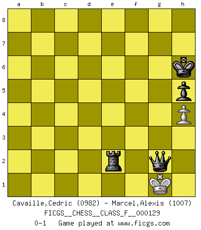 Last move : 0-1 2013 June 14 20:20:57 [Event "FICGS__CHESS__CLASS_F__000129"] [Site "FICGS"] [Date "2013.05.17"] [Round "1"] [White "Cavaille,Cedric"] [Black "Marcel,Alexis"] [Result "0-1"] [WhiteElo "0982"] [BlackElo "1007"] 1.d4 f5 2.c4 Nf6 3.Nc3 g6 4.e3 Bg7 5.Nf3 O-O 6.Be2 d6 7.O-O Re8 8.Bd3 e5 9.Be2 e4 10.Nd2 Nc6 11.d5 Ne5 12.b4 Bd7 13.c5 a6 14.Na4 dxc5 15.Nxc5 Bc8 16.Qb3 Qd6 17.Bc4 Nxc4 18.Qxc4 Qxd5 19.Qxd5+ Nxd5 20.Rb1 b6 21.Ncb3 Nc3 22.a3 Nxb1 23.Nxb1 Be6 24.Nd4 Bc4 25.Rd1 Bd3 26.Bb2 Bxd4 27.Bxd4 Bxb1 28.Rxb1 a5 29.h3 axb4 30.axb4 Rec8 31.g4 c5 32.bxc5 bxc5 33.Bc3 c4 34.gxf5 gxf5 35.Kg2 Ra3 36.Rc1 Rc6 37.Kg3 Kf7 38.Kf4 Kg6 39.h4 h5 40.f3 exf3 41.Kxf3 Re6 42.Rg1+ Kh6 43.Rc1 Re4 44.Bb2 Raxe3+ 45.Kf2 Re2+ 46.Kf1 Rxb2 47.Kg1 Rbe2 48.Rf1 c3 49.Rxf5 c2 50.Rf1 Re1 51.Rxe1 Rxe1+ 52.Kf2 c1Q 53.Kg2 Qf4 54.Kh3 Qf3+ 55.Kh2 Re2+ 56.Kg1 Qg2+ 0-1 Dutch with c4 & Nc3 Kingside Castling by player Black (move 5) Kingside Castling by player White (move 7) 10 pieces endgame at move 44 : White KRBP , Black KRRPPP WHITE : King + 1 Rook 1 Bishop 1 Pawn BLACK : King + 2 Rooks 3 Pawns 9 pieces endgame at move 46 : White KRP , Black KRRPPP WHITE : King + 1 Rook 1 Pawn BLACK : King + 2 Rooks 3 Pawns 8 pieces endgame at move 49 : White KRP , Black KRRPP WHITE : King + 1 Rook 1 Pawn BLACK : King + 2 Rooks 2 Pawns 7 pieces endgame at move 51 : White KRP , Black KRPP WHITE : King + 1 Rook 1 Pawn BLACK : King + 1 Rook 2 Pawns 6 pieces endgame at move 51 : White KP , Black KRPP WHITE : King + 1 Pawn BLACK : King + 1 Rook 2 Pawns Promotion Queen by player Black (move 52) Player Black won this chess game. Follow this game move after move (download)I am the best player in the world and I am here to prove it. (Bobby Fischer) Im Fernschach kannst du während dem Spiel rauchen. (John Christen Knudsen) Un juego de Ajedrez es un dialogo, una conversación entre un jugador y su oponente. Cada movimiento del oponente puede contener amenazas o tropiezos, pero un jugador no se puede defender de las amenazas o tomar ventaja de los tropiezos si es que no se pregunta a sí mismo: ¿Que es lo que mi oponente va a hacer después de cada movida?. (Bruce A. Moon) Avant la finale, les dieux ont créé le milieu de partie. (Tarrasch) Heh, heh, heh. Time to abandon ship. (General Grievous in Star Wars ep.3)