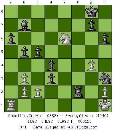 Last move : 0-1 2013 May 18 23:0:56 [Event "FICGS__CHESS__CLASS_F__000129"] [Site "FICGS"] [Date "2013.05.17"] [Round "1"] [White "Cavaille,Cedric"] [Black "Bromo,Alexis"] [Result "0-1"] [WhiteElo "0982"] [BlackElo "1140"] 1.d4 d5 2.Nc3 Nf6 3.Bg5 e6 4.e4 c6 5.Qf3 Be7 6.e5 Nfd7 7.Bxe7 Qxe7 8.Qg3 O-O 9.Nf3 h6 10.Qh4 f6 11.Qf4 fxe5 12.Qh4 Qxh4 13.Nxh4 exd4 14.Ne2 Ne5 15.Nxd4 Na6 16.Be2 Nc5 17.f3 Nf7 18.O-O e5 19.Nb3 Nxb3 20.axb3 b5 21.Ra6 Bxa6 22.Ra1 Bb7 23.Bd3 a6 24.g4 Ng5 25.Kg2 e4 26.Ng6 Rxf3 27.Ne5 Rf4 28.Kg3 Raf8 29.Ng6 Rf3+ 30.Kg2 Rf2+ 31.Kg1 Nh3+ 32.Kh1 exd3 33.Nxf8 d4 34.Ne6 c5 0-1 Richter-Veresov attack Kingside Castling by player Black (move 8) Kingside Castling by player White (move 18) Player Black won this chess game. Follow this game move after move (download)Chess problems demand from the composer the same virtues that characterize all worthwhile art: originality, invention, conciseness, harmony, complexity, and splendid insincerity. (Vladimir Nabokov) Ich habe Putins Aufstieg an die Macht beobachtet und seine Politik, die demokratischen Institutionen meines Landes zu zerstören. (Garry Kasparov) El Ajedrez es un mar en el cual un mosquito puede beber y un elefante puede bañarse. (Refrán Hindú) Ne tendez aucun piège pour le plaisir ! Ne jouez rien dans l'espoir que l'adversaire réagisse de façon stupide ! Prenez toujours pour acquis que l'adversaire va trouver le meilleur coup ! Ne jouez jamais de coup dans l'espoir que l'adversaire ne voie pas la menace ! Chacun de vos coups doit améliorer la position d'une façon ou d'une autre. The beginning of wisdom is silence. The second step is listening. (Unknown)