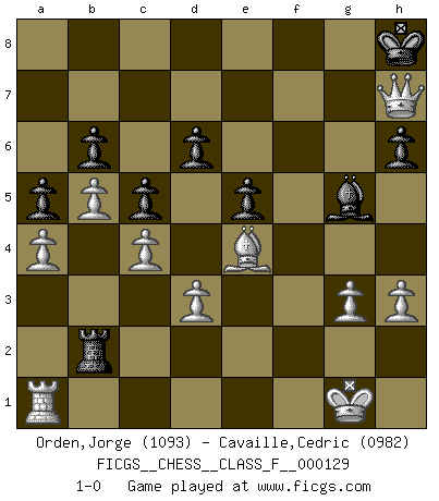 Last move : 1-0 2013 June 7 22:10:46 [Event "FICGS__CHESS__CLASS_F__000129"] [Site "FICGS"] [Date "2013.05.17"] [Round "1"] [White "Orden,Jorge"] [Black "Cavaille,Cedric"] [Result "1-0"] [WhiteElo "1093"] [BlackElo "0982"] 1.e4 e5 2.Nf3 Nc6 3.Be2 d6 4.O-O Nf6 5.d3 Be7 6.a3 O-O 7.c4 Nd4 8.b4 b6 9.Bb2 c5 10.Nbd2 a5 11.b5 Bg4 12.a4 Nxf3+ 13.Nxf3 Bxf3 14.Bxf3 Qd7 15.h3 Ne8 16.Kh2 f5 17.exf5 Qxf5 18.Be4 Qf4+ 19.g3 Qxf2+ 20.Rxf2 Rxf2+ 21.Kg1 Rxb2 22.Bxa8 Bg5 23.Qh5 h6 24.Qxe8+ Kh7 25.Be4+ g6 26.Qxg6+ Kh8 27.Qh7+ 1-0 Inverted Hungarian Kingside Castling by player White (move 4) Kingside Castling by player Black (move 6) Player White won this chess game. Follow this game move after move (download)Chess is not like life... it has rules ! (Mark Pasternak) Capablanka war das größte Genie der Schachgeschichte! Aber denken sie nicht er habe nichts vom Schach verstanden. Er wusste nur soviel wie er wissen musste um seine Ziele zu erreichen. (Mikhail Moiseyevich Botvinik) Solo el jugador con la iniciativa tiene el derecho a atacar. (Wilhelm Steinitz) La solitude du joueur d'Echecs à l'approche du mat est semblable à celle du condamné. (Francis Szpiner) All war is based on deception. (Sun Tzu)