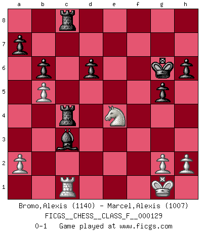 Last move : 0-1 2013 May 28 20:35:7 [Event "FICGS__CHESS__CLASS_F__000129"] [Site "FICGS"] [Date "2013.05.17"] [Round "1"] [White "Bromo,Alexis"] [Black "Marcel,Alexis"] [Result "0-1"] [WhiteElo "1140"] [BlackElo "1007"] 1.d4 g6 2.c4 Bg7 3.e3 c5 4.Nc3 cxd4 5.exd4 Nf6 6.f3 O-O 7.Bd3 d6 8.Nge2 Nbd7 9.b4 b6 10.b5 Bb7 11.Be4 Bxe4 12.fxe4 Qc7 13.Qd3 Rac8 14.O-O Qxc4 15.Qxc4 Rxc4 16.Bg5 h6 17.Bh4 g5 18.Bg3 Rfc8 19.Rac1 Kf8 20.e5 dxe5 21.dxe5 Ne8 22.e6 Ndf6 23.exf7 Kxf7 24.Be5 Nd6 25.Bxd6 exd6 26.Rf3 Kg6 27.Ng3 Nd5 28.Nge4 Nxc3 29.Rfxc3 Bxc3 0-1 Modern defense Kingside Castling by player Black (move 6) Kingside Castling by player White (move 14) Player Black won this chess game. Follow this game move after move (download)A good player is always lucky. (Jose Raul Capablanca) Eine Person mit durchschnittlichem IQ kann etwa eine ELO von 2000 erreichen. (Jonathan Levitt) En el Ajedrez, tal como es jugado por los Maestros, practicamente la suerte es eliminada. (Emanuel Lasker) Pour moi, les échecs ne sont pas un jeu mais un art. (Alexandre Alekhine) You think that education is too expensive ? Try ignorance. (Derek Bok)