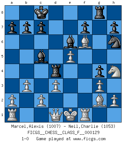 Last move : 1-0 2013 May 28 9:35:21 [Event "FICGS__CHESS__CLASS_F__000129"] [Site "FICGS"] [Date "2013.05.17"] [Round "1"] [White "Marcel,Alexis"] [Black "Neil,Charlie"] [Result "1-0"] [WhiteElo "1007"] [BlackElo "1053"] 1.f4 e5 2.fxe5 d6 3.exd6 Bxd6 4.Nf3 g5 5.g3 g4 6.Nh4 Nh6 7.e4 Nc6 8.Bg2 Ne5 9.b3 Qf6 10.Nc3 Be6 11.Bb2 Bc5 12.Nb5 O-O-O 13.Rf1 Qe7 14.Bxe5 Rhg8 15.Bf6 Qd6 16.Nxd6+ Rxd6 17.e5 Rd4 18.d3 1-0 Bird : From gambit, Lasker variation Queenside Castling by player Black (move 12) Player White won this chess game. Follow this game move after move (download)When you play Bobby, it is not a question if you win or lose. It is a question if you survive. (Boris Spassky) Der Vorposten provoziert a) eine Basis für neue Angriffe und b) eine Schwächung der gegnerischen Widerstandskraft in der fraglichen Linie. (Aaron Nimzowitsch) Yo jugué Ajedrez con el y a veces le pude haber ganado solo que siempre devuelve su última jugada y juega la partida de manera diferente. (Mark Twain) Mais l'homme est une créature légère et illogique : semblable au joueur d'échecs, il n'aime que le processus du but à atteindre, non le but lui-même. (Dostoïevsky) No man has ever achieved immortality in his own life time. (Unknown)