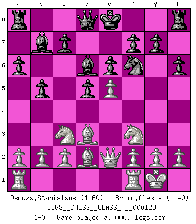 Last move : 1-0 2013 May 24 18:56:10 [Event "FICGS__CHESS__CLASS_F__000129"] [Site "FICGS"] [Date "2013.05.17"] [Round "1"] [White "Dsouza,Stanislaus"] [Black "Bromo,Alexis"] [Result "1-0"] [WhiteElo "1160"] [BlackElo "1140"] 1.d4 d5 2.e3 Nf6 3.Nf3 Nc6 4.Nc3 e6 5.Bd3 h6 6.O-O Bd6 7.Bd2 a6 8.Qe2 b5 9.e4 Bb7 10.e5 Nxe5 11.dxe5 1-0 Queen's pawn game Kingside Castling by player White (move 6) Player White won this chess game. Follow this game move after move (download)You have to have the fighting spirit. You have to force moves and take chances. (Bobby Fischer) Schach ist die gewalttätigste aller Sportarten. (Garry Kasparov) Una compensación adecuada por un sacrificio es tener una combinación sólida que conduce a una posición ganadora; una compensación adecuada por una metida de pata es dejar a tu oponente arrebatar una derrota de las fauces de la victoria. (Bruce A. Moon) La victoire dans une partie d'Echecs appartient la plupart du temps à celui qui voit un peu plus loin que l'adversaire. (Lasker) Now be brave and don't look back. Don't look back. (Shmi Skywalker in Star Wars ep.1)