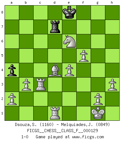 Last move : 1-0 2013 July 17 19:20:1 [Event "FICGS__CHESS__CLASS_F__000129"] [Site "FICGS"] [Date "2013.05.17"] [Round "1"] [White "Dsouza,Stanislaus"] [Black "Melquiades,Jay"] [Result "1-0"] [WhiteElo "1160"] [BlackElo "0849"] 1.d4 d5 2.Nf3 Bg4 3.Ne5 Be6 4.e3 a6 5.Bd3 f6 6.Nf3 g6 7.O-O Bf5 8.Bxf5 gxf5 9.Qd3 e5 10.dxe5 fxe5 11.Nxe5 Nf6 12.Nc3 Bd6 13.f4 Bc5 14.Qxf5 Nbd7 15.Nxd7 Nxd7 16.Nxd5 Nf6 17.Nxf6+ Kf7 18.Ne4 Ke8 19.Nf6+ Kf8 20.Nd7+ Ke8 21.Nxc5 Rf8 22.Qxh7 Rf7 23.Qg8+ Rf8 24.Qe6+ Qe7 25.Qxe7+ Kxe7 26.Nxb7 Rf5 27.Bd2 Rh8 28.Bc3 Rh6 29.Rf3 Rfh5 30.h3 Rg6 31.Be5 Rh7 32.Nc5 Rg8 33.Bxc7 Kf6 34.Be5+ Ke7 35.e4 a5 36.Rd1 Rc8 37.Bd4 Kf8 38.Ne6+ Ke8 39.c3 Re7 40.f5 a4 41.b3 Rd7 42.Rg3 Rxc3 43.Rxc3 1-0 Queen's pawn game Kingside Castling by player White (move 7) Player White won this chess game. Follow this game move after move (download)Chess is everything: art, science and sport. (Anatoly Karpov) Wer sich die Fähigkeit anerziehen will im Schach selbstständig zu denken, der muß alles meiden, was leblos ist: ausgeklügelte Theorien, die sich auf sehr wenige Beispiele und eine Menge Hirngespinste stützen. (Emanuel Lasker) A través de las casillas del tablero, los Indios explican el movimiento del tiempo y la edad, las influencias mas altas que controlan el mundo y los lazos que vinculan al Ajedrez con el alma humana. (Al-Masudi) J'ai vu le vaincu d'Echecs jouer des années durant dans l'espoir de la fête de la victoire. Car tu es plus riche de ce qu'elle existe si même elle n'est point pour toi. Ainsi de la perle du fond des mers. (Antoine de Saint-Exupéry) There is a computer disease that anybody who works with computers knows about. It's a very serious disease and it interferes completely with the work. The trouble with computers is that you 'play' with them ! (Richard P. Feynman)