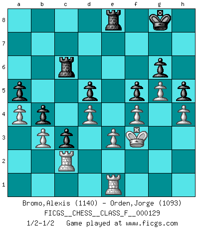 Last move : 1/2-1/2 2013 June 19 11:25:20 [Event "FICGS__CHESS__CLASS_F__000129"] [Site "FICGS"] [Date "2013.05.17"] [Round "1"] [White "Bromo,Alexis"] [Black "Orden,Jorge"] [Result "1/2-1/2"] [WhiteElo "1140"] [BlackElo "1093"] 1.d4 d5 2.c4 e6 3.Nc3 Nf6 4.Nf3 Be7 5.Bf4 a6 6.e3 O-O 7.Bd3 c5 8.cxd5 Nxd5 9.Nxd5 exd5 10.h3 c4 11.Bc2 Nc6 12.a3 b5 13.O-O Be6 14.Ne5 Nxe5 15.Bxe5 f6 16.Bg3 Bd6 17.Bxd6 Qxd6 18.Qh5 f5 19.g4 g6 20.Qg5 Qd8 21.Qh6 Qd7 22.g5 Qg7 23.Qh4 h5 24.Qf4 Qe7 25.h4 Rac8 26.f3 Qc7 27.Qh2 Qxh2+ 28.Kxh2 c3 29.b3 a5 30.f4 Bd7 31.Rfc1 Ra8 32.Bd3 Rfe8 33.Re1 b4 34.a4 Rac8 35.Rac1 Re6 36.Rc2 Rce8 37.Rce2 Bc8 38.Kg3 Ba6 39.Bxa6 Rxa6 40.Kf3 Rc6 41.Rc2 1/2-1/2 QGD : Classical variation (5.Bf4) Kingside Castling by player Black (move 6) Kingside Castling by player White (move 13) This chess game ended in a draw. Follow this game move after move (download)Combinations have always been the most intriguing aspect of Chess. The masters look for them, the public applauds them, the critics praise them. It is because combinations are possible that Chess is more than a lifeless mathematical exercise. They are the poetry of the game; they are to Chess what melody is to music. They represent the triumph of mind over matter. (Reuben Fine) Schach ist Leben. (Robert James Fischer) El arma más poderosa en el Ajedrez, es tener la próxima movida. (David Bronstein) Plusieurs personnes se sont demandées comment Tal faisait pour gagner... En fait, c'est très simple ! Il met ses pièces au centre de l'échiquier et les sacrifie quelque part ! (David Bronstein) To err is human, but to really foul things up requires a computer. (Farmer's Almanac, 1978)