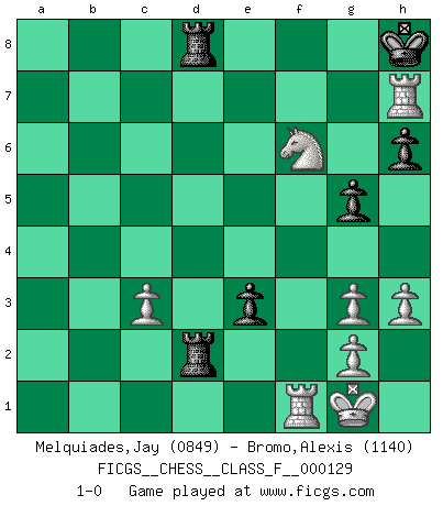 Last move : 1-0 2013 May 23 21:39:3 [Event "FICGS__CHESS__CLASS_F__000129"] [Site "FICGS"] [Date "2013.05.17"] [Round "1"] [White "Melquiades,Jay"] [Black "Bromo,Alexis"] [Result "1-0"] [WhiteElo "0849"] [BlackElo "1140"] 1.e4 e5 2.d4 d6 3.h3 Nf6 4.dxe5 dxe5 5.Qxd8+ Kxd8 6.Bd3 Nc6 7.Bg5 Be7 8.Nf3 h6 9.Bh4 g5 10.Bg3 Bd6 11.c3 a6 12.Nbd2 b5 13.Nb3 Be6 14.Nbd2 Bc4 15.Bxc4 bxc4 16.Nxc4 Nxe4 17.Rd1 Ke7 18.O-O Nxg3 19.fxg3 f6 20.Nxd6 cxd6 21.Nd2 d5 22.Nb3 Rhd8 23.Nc5 Rab8 24.Nxa6 Rxb2 25.Nc7 Rxa2 26.Nxd5+ Kf7 27.Rxf6+ Kg7 28.Rxc6 e4 29.Rc7+ Kh8 30.Rf1 Rd2 31.Nf6 e3 32.Rh7+ 1-0 King's pawn game Kingside Castling by player White (move 18) Player White won this chess game. Follow this game move after move (download)No other master has such a terrific will to win. At the board he radiates danger, and even the strongest opponents tend to freeze, like rabbits when they smell a panther. Even his weaknesses are dangerous. As white, his opening game is predictable - you can make plans against it - but so strong that your plans almost never work. In the middle game his precision and invention are fabulous, and in the end game you simply cannot beat him. (Anonymous German Expert) Nicht daß Diemer aus Opportunismus Mitglied der NSDAP geworden wäre. Er war ein Fanatiker, in allem, was er tat. (Hans Ree) El Ajedrez es parte de una cultura y si una cultura esta en decadencia, entonces también el Ajedrez declinará. (Mikhail Botvinnik) Même si vous avez un bon coup à faire, regardez toujours s'il n'y en a pas un qui lui soit préférable. (Pedro Damiano) All the biggest technological inventions created by man - the airplane, the automobile, the computer - says little about his intelligence, but speaks volumes about his laziness. (Mark Kennedy)