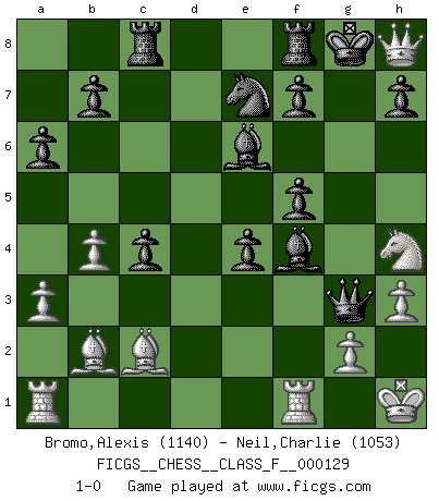 Last move : 1-0 2013 May 28 5:57:56 [Event "FICGS__CHESS__CLASS_F__000129"] [Site "FICGS"] [Date "2013.05.17"] [Round "1"] [White "Bromo,Alexis"] [Black "Neil,Charlie"] [Result "1-0"] [WhiteElo "1140"] [BlackElo "1053"] 1.d4 Nf6 2.c4 c5 3.dxc5 Nc6 4.e3 e5 5.Nc3 Bxc5 6.a3 a6 7.b4 Ba7 8.Bb2 O-O 9.h3 d6 10.Nf3 Be6 11.Nd5 Rc8 12.Nxf6+ gxf6 13.Bd3 Bb8 14.O-O Ne7 15.Nh4 f5 16.c5 dxc5 17.f4 e4 18.Bc2 c4 19.Qh5 Qd2 20.Qh6 Qxe3+ 21.Kh1 Qg3 22.Qf6 Bxf4 23.Qh8+ 1-0 Benoni defense Kingside Castling by player Black (move 8) Kingside Castling by player White (move 14) Player White won this chess game. Follow this game move after move (download)In complicated positions, Bobby Fischer hardly had to be afraid of anybody. (Paul Keres) Viele Opfer benötigen überhaupt keine konkrete Berechnung. Es genügt sich die entstehende Position kurz vorzustellen, um uns davon zu überzeugen, dass das Opfer korrekt ist. (Mikhail Nekhemyevich Tal) Las Aperturas te enseñan aperturas. ¡Los Finales te enseñan Ajedrez!. (Stephan Gerzadowicz) Demandez au pauvre Cg1 ce qu'il en pense. Eduard Gufeld à propos de la variante Saemisch de l'Est-Indienne. Wisdom doesn't necessarily come with age. Sometimes age just shows up all by itself. (Tom Watson)