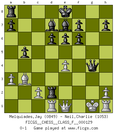 Last move : 0-1 2013 May 28 2:10:3 [Event "FICGS__CHESS__CLASS_F__000129"] [Site "FICGS"] [Date "2013.05.17"] [Round "1"] [White "Melquiades,Jay"] [Black "Neil,Charlie"] [Result "0-1"] [WhiteElo "0849"] [BlackElo "1053"] 1.e4 e6 2.Nf3 c5 3.Nc3 Nc6 4.d4 cxd4 5.Nxd4 Nf6 6.Nxc6 bxc6 7.Bg5 Qa5 8.Bxf6 gxf6 9.a3 d6 10.b4 Qc7 11.f3 Be7 12.b5 Bd7 13.Bc4 Rg8 14.Ne2 cxb5 15.Bb3 Rxg2 16.Nf4 Qc3+ 17.Kf1 Rd2 18.Qe1 Qxf3+ 19.Kg1 Qxf4 20.Rd1 Qg4+ 0-1 French defense Player Black won this chess game. Follow this game move after move (download)Fischer prefers to enter Chess history alone. (Miguel Najdorf) Fischer: 'Remis!?' Uhlmann: 'Aber es muss doch dreimal Zugwiederholung sein!' Fischer: 'Sie nehmen das Remis an, wie ich es sage, sonst spiele ich weiter und werde Sie dann schlagen!' (Robert James Fischer) Jugadores de primera clase pierden en contra de jugadores de segunda clase porque los jugadores de segunda clase a veces juegan una partida de primer clase. (Siegbert Tarrasch) Les réformistes prétendent que les progrès de la théorie conduiront à la disparition des échecs, et qu'il faut, pour leur rendre vie, en remanier les règles. En réalité, qu'exprime cette affirmation? Le mépris de l'intuition, de l'imagination et de tous les autres éléments qui font des échecs un art. (Alexander Alekhine) This is where the fun begins. (Anakin Skywalker in Star Wars ep.3)