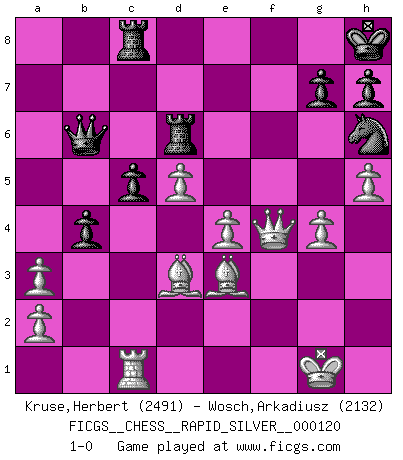 Last move : 1-0 2013 August 6 9:57:54 [Event "FICGS__CHESS__RAPID_SILVER__000120"] [Site "FICGS"] [Date "2013.05.17"] [Round "1"] [White "Kruse,Herbert"] [Black "Wosch,Arkadiusz"] [Result "1-0"] [WhiteElo "2491"] [BlackElo "2132"] 1.e4 e5 2.Nf3 Nc6 3.Bb5 a6 4.Ba4 Nf6 5.O-O Be7 6.Re1 b5 7.Bb3 d6 8.c3 O-O 9.h3 Na5 10.Bc2 c5 11.d4 Qc7 12.Nbd2 cxd4 13.cxd4 Nc6 14.Nb3 a5 15.Be3 a4 16.Nbd2 Bd7 17.Rc1 Qb7 18.Nf1 Rfe8 19.Ng3 Bd8 20.d5 Ne7 21.Nh4 Kh8 22.Bd3 Bb6 23.Bg5 Nfg8 24.Qf3 Rf8 25.Bd2 Bc5 26.Red1 Qb6 27.Nhf5 Bxf5 28.Nxf5 Nxf5 29.Qxf5 Ra7 30.Rxc5 dxc5 31.Qxe5 Re7 32.Qg3 Rd8 33.Bf4 Red7 34.Be2 Ne7 35.Be3 b4 36.Rc1 Rc8 37.h4 f5 38.h5 Ng8 39.Qf4 Nh6 40.Bd3 R7d8 41.f3 Rd6 42.g4 fxg4 43.fxg4 a3 44.bxa3 1-0 Ruy Lopez : Closed Kingside Castling by player White (move 5) Kingside Castling by player Black (move 8) Player White won this chess game. Follow this game move after move (download)My God, Bobby Fischer plays so simply. (Alexei Suetin) Auf jeden Fall musst du zuerst Rechtsanwalt werden, damit du deine eigenen Interessen und die deiner Familie vertreten kannst. [Brief an seinen Sohn] (José Raúl Capablanca) Fischer es el jugador mas fuerte del mundo. De hecho, el jugador mas fuerte que jamas haya existido. (Larry Evans) Le profane ne songe pas à la somme de jouissance dont il se prive, qui méconnaît ce jeu aux ressources aussi variées que passionnantes. (Jean-Marie Jeanton-Lamarche) He who is a good ruler must first have been ruled. (Aristotle)
