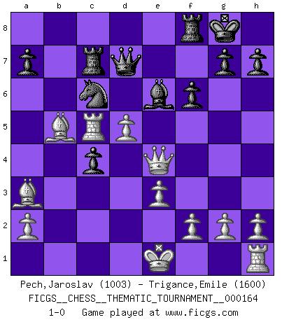 Last move : 1-0 2013 October 1 9:29:42 [Event "FICGS__CHESS__THEMATIC_TOURNAMENT__000164"] [Site "FICGS"] [Date "2013.05.21"] [Round "1"] [White "Pech,Jaroslav"] [Black "Trigance,Emile"] [Result "1-0"] [WhiteElo "1003"] [BlackElo "1600"] 1.b4 e5 2.Bb2 f6 3.b5 d5 4.e3 Be6 5.d4 Nd7 6.Nf3 e4 7.Nfd2 Bd6 8.c4 c6 9.Nc3 Ne7 10.bxc6 bxc6 11.cxd5 cxd5 12.Nb5 Nb6 13.Qb3 Qd7 14.Nxd6+ Qxd6 15.Ba3 Qd7 16.Bb5 Nc6 17.Rc1 Rc8 18.Rc5 Rc7 19.Qc2 Nc4 20.Nxc4 dxc4 21.Qxe4 O-O 22.d5 1-0 Polish (Sokolsky) opening Kingside Castling by player Black (move 21) Player White won this chess game. Follow this game move after move (download)Chess is thirty to forty percent psychology. You don't have this when you play a computer. I can't confuse it. (Judith Polgar) Ich verstehe Aljechins Kombinationen ganz gut; aber woher er diese Angriffschancen bekommt und wie er die Eröffnung behandelt das ist für mich ein Buch mit sieben Siegeln. (Rudolf Spielmann) El Ajedrez es un juego terrible. Si no dominas el centro, tu oponente tiene una posición mas libre. Si tu tienes el centro, entonces realmente tienes algo de que preocuparte. (Siegbert Tarrasch) Toute estimation doit être constamment réévaluée. (Jacob Estrin) Yoga is 99% practice and 1% knowledge. (Sri Krishna Pattabhi Jois)