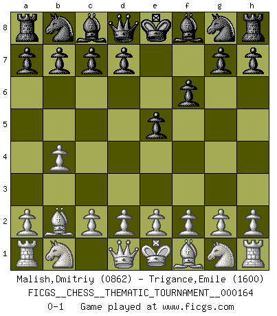 Last move : 0-1 2013 July 1 2:40:53 [Event "FICGS__CHESS__THEMATIC_TOURNAMENT__000164"] [Site "FICGS"] [Date "2013.05.21"] [Round "1"] [White "Malish,Dmitriy"] [Black "Trigance,Emile"] [Result "0-1"] [WhiteElo "0862"] [BlackElo "1600"] 1.b4 e5 2.Bb2 f6 0-1 This chess game has been lost on time (started : 2013.05.21 13:52:41) Polish (Sokolsky) opening Player Black won this chess game. Follow this game move after move (download)In Chess, just as in life, today's bliss may be tomorrow's poison. (Assaic) Konzentriere dich auf materielle Gewinne. Nimm, was dir dein Gegner gibt, ausser es gibt einen guten Grund der dagegenspricht. (Robert James Fischer) Existen dos clases de sacrificios: los correctos y los míos. (Mikhail Tal) Votre prénom est 'Tactique', votre deuxième prénom est 'Tactique' et votre nom est 'Tactique'. (Ken Smith) Ah, the Socrating method. The best way we have of teaching everything-apart from juggling chainsaws. (Gregory House, House M.D.)
