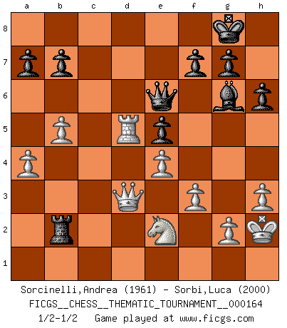 Last move : 1/2-1/2 2013 June 18 3:56:27 [Event "FICGS__CHESS__THEMATIC_TOURNAMENT__000164"] [Site "FICGS"] [Date "2013.05.21"] [Round "1"] [White "Sorcinelli,Andrea"] [Black "Sorbi,Luca"] [Result "1/2-1/2"] [WhiteElo "1961"] [BlackElo "2000"] 1.b4 e5 2.a3 d5 3.Bb2 Bd6 4.e3 Nf6 5.c4 dxc4 6.Bxc4 O-O 7.Qc2 Bg4 8.Nc3 Nbd7 9.Nge2 c5 10.f3 Bh5 11.b5 Nb6 12.d3 Bg6 13.e4 Ne8 14.Ba2 c4 15.dxc4 Rc8 16.O-O Nxc4 17.Bxc4 Rxc4 18.Qb3 Rc8 19.Rfd1 Nf6 20.Rac1 Qe7 21.a4 Rfd8 22.Nd5 Nxd5 23.Rxd5 h6 24.Rxc8 Rxc8 25.h3 Qe6 26.Ba3 Bxa3 27.Qxa3 Rc2 28.Qd3 Rb2 29.Kh2 1/2-1/2 Polish (Sokolsky) opening Kingside Castling by player Black (move 6) Kingside Castling by player White (move 16) This chess game ended in a draw. Follow this game move after move (download)I had a toothache during the first game. In the second game I had a headache. In the third game it was an attack of rheumatism. In the fourth game, I wasn't feeling well. And in the fifth game? Well, must one have to win every game ? (Siegbert Tarrasch) Über Kasparov: Es ist offensichtlich, daß er in einem totalitären Staat aufwuchs und deshalb zu diktatorischen Zügen neigt. (Viktor Kortschnoi) Debemos de asegurarnos de que el Ajedrez no se convierta en un lenguaje muerto, muy interesante, pero tan solo para un grupo muy pequeño. (Sytze Faber) Il n'y a plus de joueurs du niveau de Jacob Murray dont la seule quête est le beau jeu, le plaisir de voir les pièces construire quelque chose. Sur 10 idées à la minute, 9 seront sans intérêt, la dernière s'avèrera géniale. (Christian Bauer) It is not true that people stop pursuing dreams because they grow old, they grow old because they stop pursuing dreams. (Gabriel Garcia Marquez)